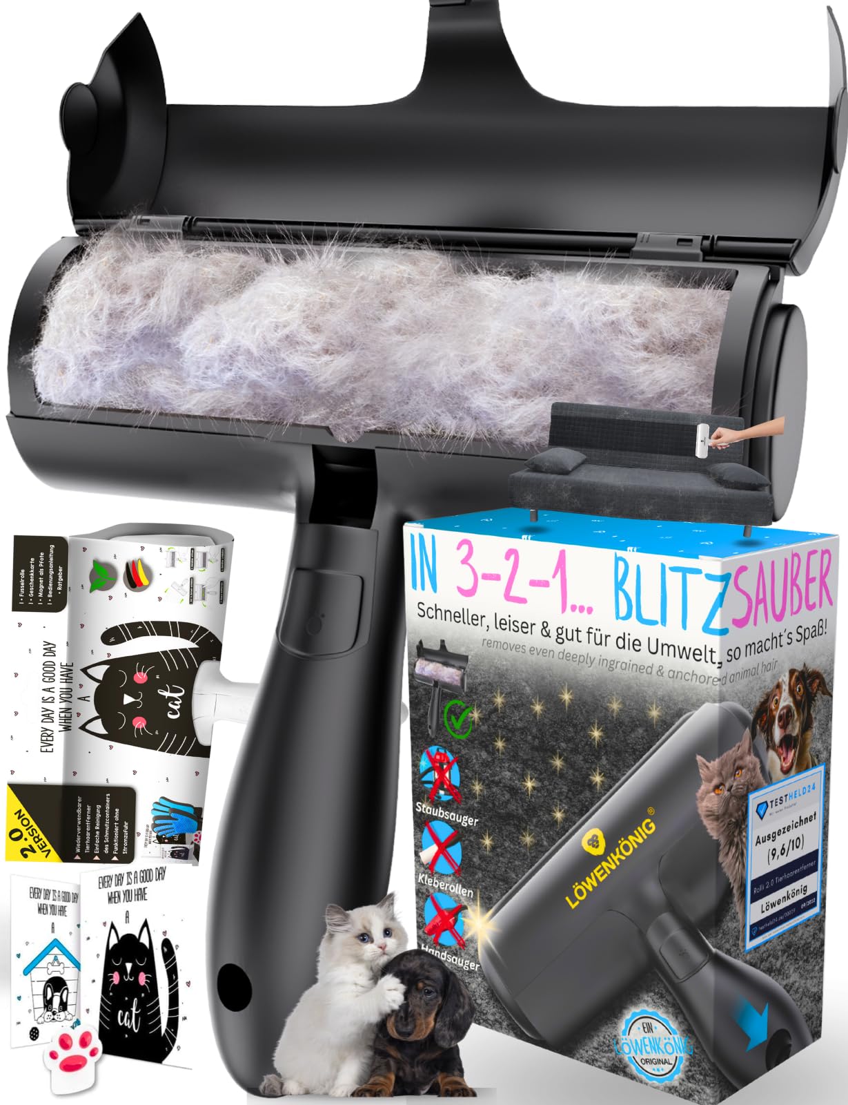 Animal hair removal in no time: Our clothing and upholstery brush for dog and cat hair is stable and solid, but at the same time smooth and comfortable in the handling.Ideal for on the go!.ready for use at any time - the hair remover for animal hair does not need electricity or batteries.Hair, dust and fluff of furniture, blankets, scratching post, etc. are removed by back and forth.wear black with confidence - cuddling cat and off to work - no problem with our lint roller, because as a clothing brush, he gently removes the traces of your hairy houses.Save your social life - avoid friends your apartment because all the seats of dog or cat hair are coveredOur miracle brush makes chairs, sofas and armchairs socially acceptable in seconds.Time -saving effective - usually the process of hair removal throughout the household takes away a lot of time to the pet owners.Even after vacuuming and wiping, there are usually some animal hair left.With Rolli you can reach maximum results in no time.Rolli is cheaper than adhesive rolls and lighter than any hand vacuum cleaner!.sustainable environmentally friendly - the nylon and ABS plastic with high quality ensure convenience durability of the pet hair remover role.Rolli is also sustainable, also because it can be reused thousands of times without having to buy adhesive rolls like with conventional lint rollers.uncomplicated without electricity the lint brush before and back.It is best to put your thumb or index finger on the upper flap, as we show it in our video to prevent the flap from opening up if the process is faster.The collected animal hair must be removed from the container at the push of a button.Practical thorough - thanks to Rolli's large shaft, it is possible to clean several furniture without having to go out in between.The ergonomic handle gives our animal hair brush your bombproof stability.The durable rubber lip transports the animal hair into the container uncomplicated.versatile application - ""Rolli 2.0"" - Your new lint roller - uses the friction principle to keep furniture clean.The animal hair remover frees the sofa, armchair, bed, carpet, scratching post animal baskets effectively from cat or dog hair, fluff everyday dust.With the wheelchair, your textile furniture immediately looks like new!.TIERHAARENTFERNUNG IM HANDUMDREHEN: Unsere Kleider- und Polsterbürste für Hunde- u. Katzenhaare ist stabil und solide, aber gleichzeitig leichtgängig und bequem in der Handhabung. Ideal für unterwegs!. JEDERZEIT EINSATZBEREIT - Der Haarentferner für Tierhaare braucht weder Strom noch Batterien. Durch hin- und herrollen werden Haare, Staub und Flusen von Möbeln, Decken, Kratzbaum etc. entfernt. TRAG SCHWARZ MIT SELBSTVERTRAUEN - Katze knuddeln und ab in die Arbeit – kein Problem mit unserem Fusselroller, denn als Kleiderbürste entfernt er schonend die Spuren deiner haarigen Hausgenossen. RETTE DEIN SOZIALLEBEN - Meiden Freunde deine Wohnung, weil sämtliche Sitzflächen von Hunde- oder Katzenhaaren bedeckt sindUnsere Wunderbürste macht Stühle, Sofas und Sessel salonfähig in Sekunden. ZEITSPAREND EFFEKTIV – Normalerweise nimmt der Vorgang der Haarentfernung im ganzen Haushalt den Tierbesitzern eine Menge Zeit weg. Selbst nach dem Staubsaugen und Wischen bleiben meist einige Tierhaare übrig. Mit Rolli erreichst Du maximale Ergebnisse in kürzester Zeit. Rolli ist preiswerter als Kleberollen und leichter als jeder Handstaubsauger!. NACHHALTIG UMWELTFREUNDLICH – Das Nylon und ABS Plastik mit hoher Qualität gewährleisten Bequemlichkeit Dauerhaftigkeit der Haustierhaarentferner Rolle. Rolli ist aber auch nachhaltig, auch weil er tausende Male wiederverwendet werden kann, ohne Kleberollen nachkaufen zu müssen wie bei herkömmlichen Fusselrollen. UNKOMPLIZIERT OHNE STROM – Rolle die Fusselbürste vor und zurück. Lege dazu am besten deinen Daumen oder Zeigefinger auf die obere Klappe, so wie wir es in unserem Video zeigen, um zu verhindern, dass die Klappe sich bei schnellerem Vorgang öffnet. Das gesammelte Tierhaar ist easy per Knopfdruck aus dem Behälter zu entfernen. PRAKTISCH GRÜNDLICH – Dank Rollis großem Schachts ist es möglich, gleich mehrere Möbel sauber zu machen, ohne dazwischen ausleeren gehen zu müssen. Der ergonomische Handgriff verleiht unserer Tierhaarbürste ihre bombenfeste Stabilität. Die langlebige Gummilippe befördert die Tierhaare dabei unkompliziert in den Behälter. VIELSEITIGE ANWENDUNG – "Rolli 2.0" - dein neuer Fusselroller - nutzt das Reibungsprinzip für sich um Möbel sauber zu halten. Der Tierhaarentferner befreit Sofa, Sessel, Bett, Teppich, Kratzbaum Tierkörbchen effektiv von Katzen- oder Hundehaare, Flusen Alltagsstaub. Mit dem Rolli sehen deine Textilmöbel sofort wieder aus wie neu!.LÖWENKÖNIG Rolli 2.0 Tierhaarentferner Innovation I Fusselrolle Tierhaare für Hunde Katzen I Katzenhaarentferner Selbstreinigend I Ideal für Sofa, Auto, Kleidung, Kratzbaum Bestseller: Schwarz Inkl. Zubehör