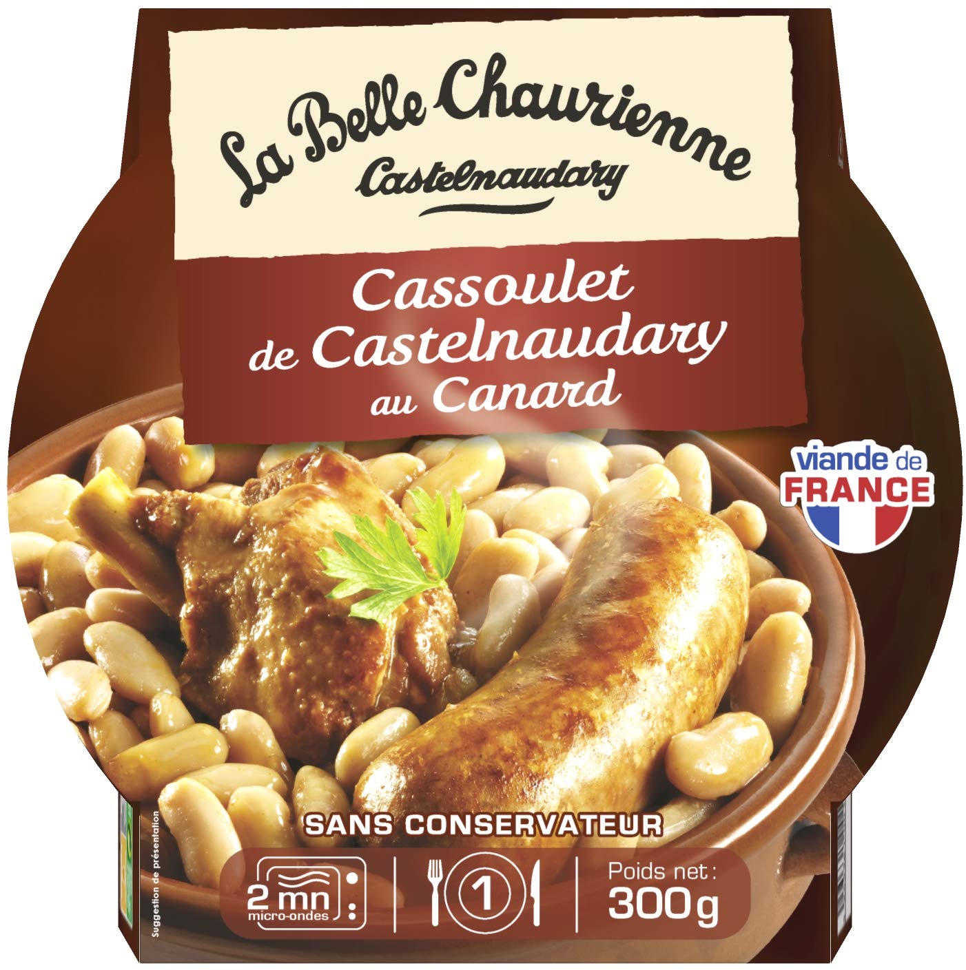 A micro-nodal tray specially for busy gourmets: 2 minutes to heat them up and take them anywhere for your lunch break. This duck cassoulet is cooked just like at home and with meats from France. INGREDIENTS Cooked sauce: water, tomato paste, salt, duck fat, garlic, pepper - Lingot beans - Precooked duck sleeve 23 : duck sleeve from France, salt - Grilled Toulouse sausage 16 : pork meat and fat from France, water, natural pork cg, salt, pepper. ( expressed at the time of packaging) INSTRUCTIONS FOR USE In the microwave: pierce the seal with a fork and heat for 2 minutes at maximum power. In a bain-marie: immerse the closed tray in simmering water for 8 minutes. Run it under cold water before opening. SAFETY WARNING Before opening: store at room temperature Meat from France. Prepared in Castelnaudary. Une barquette micro-nodale spécialement pour les gastronomes pressés: 2 minutes pour les réchauffer et à emporter partout pour votre pause déjeuner. Ce cassoulet au canard est cuisiné comme à la maison et avec des viandes d'origine France. INGRÉDIENTS Sauce cuisinée : eau, concentré de tomate, sel, graisse de canard, ail, poivre - Haricots lingots - Manchon de canard précuit 23 : manchon de canard origine France, sel - Saucisse de Toulouse grillée 16 : viande et gras de porc origine France, eau, boyau naturel de porc, sel, poivre. ( exprimés à l'emboîtage) MODE D'EMPLOI Au micro-ondes : percer l'opercule avec une fourchette et faire chauffer pendant 2 minutes puissance maximale. Au bain-marie : plongez la barquette fermée dans l'eau frémissante durant 8 minutes. La passer sous l'eau froide avant l'ouverture. AVERTISSEMENT DE SÛRETÉ Avant ouverture : conserver à temperature ambiante Viande origine France. Préparé à Castelnaudary.