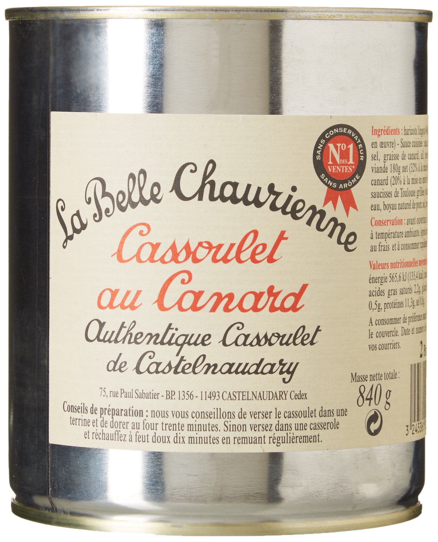 Our cassoulets are cooked just like at home! La Belle Chaurienne is the SPECIALIST in local gastronomy. Discover all the originality of this recipe. INGREDIENTS Lingot beans 400g net (35 when prepared) - Cooked sauce: water, tomato paste, salt, duck fat, garlic, pepper - Charcuterie and meat 180g (32 when prepared): duck meat from France (20 when prepared of the total net weight) grilled Toulouse sausages (pork from the EU, pork fat, water, natural pork cg, salt, pepper). INSTRUCTIONS FOR USE We recommend pouring the cassoulet into a terrine and browning in the oven for thirty minutes. Alternatively, pour into a saucepan and heat gently for ten minutes, stirring regularly. SAFETY WARNING For your health, avoid eating too much fat, too much sugar, or too much salt. 100 natural ingredients. Serves 2. Preservative-free and flavor-free. Nos cassoulets sont cuisinés comme à la maison ! La Belle Chaurienne est la SPÉCIALISTE de la gastronomie du terroir. Découvrez toute l'originalité de cette recette. INGRÉDIENTS Haricots lingots 400g net (35 à la mise en œuvre) - Sauce cuisinée : eau, concentré de tomate, sel, graisse de canard, ail, poivre - Charcuterie et viande 180g (32 à la mise en œuvre) : viande de canard origine France (20 à la mise en œuvre du poids net total) saucisses de Toulouse grillées (viande de porc origine UE, gras de porc, eau, boyau naturel de porc, sel, poivre). MODE D'EMPLOI Nous vous conseillons de verser le cassoulet dans une terrine et de dorer au four trente minutes. Sinon versez dans une casserole et réchauffez à feu doux dix minutes en rémuant régulièrement. AVERTISSEMENT DE SÛRETÉ Pour votre santé éviter de manger trop gras, trop sucré, trop salé. Ingrédients 100 d'origine naturelle. Pour 2 personnes. Sans conservateur et sans arôme.