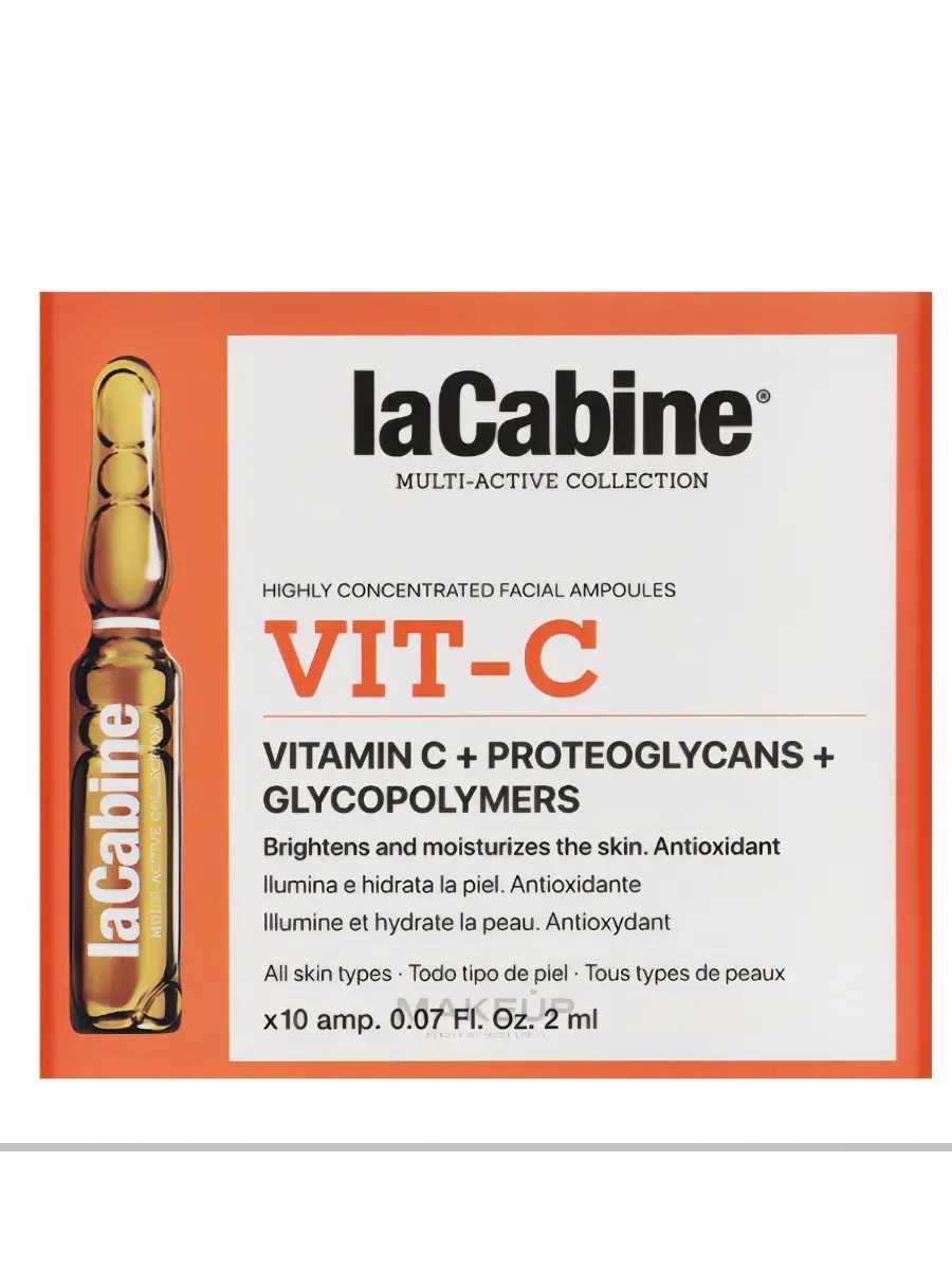 Не откладывайте и попробуйте ампулы Vitamin C Ampoules, чтобы придать лицу дополнительную свежесть, сияние и энергию! Специалисты бренда La Cabine разработали незаменимое средство по уходу за кожей, содержащее уникальную формулу с витамином С, протеогликанами и гликополимерами. Витамин С является мощным антиоксидантом, помогающим бороться с вредными воздействиями окружающей среды, такими как солнечные лучи и загрязнение воздуха. Этот бюти-продукт поддерживает гидратацию и эластичность эпидермиса, уменьшает признаки усталости и усиливает естественные защитные функции.