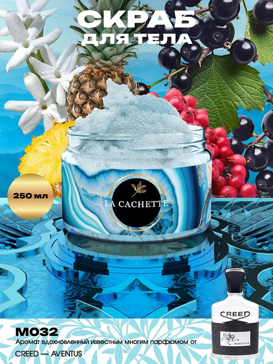 Крем-скраб для тела парфюмированный La Cachette M032 Aventus, 250 мл. Нежный соляной скраб с парфюмерной отдушкой Aventus от Creed сочетает в себе свойства скраба и увлажняющего крема. Способствует лучшему проникновению активных веществ из последующих уходовых средств, таких как маски или кремы. Предназначен для глубокого очищения кожи, удаления ороговевших клеток, избавления от загрязнений и снижения жирности. Крем увлажняет кожу, делая ее мягкой и гладкой. В качестве абразива используется морская соль. Мгновенный эффект уже после первого применения: кожа становится более гладкой, свежей и сияющей. Состав: Морская соль, глицерин, стеариновая кислота, кокосульфат натрия, EDTA, метилклороизотин, метилизолион, парфюмерная отдушка. Способ применения: Взять небольшое количество скраба, равномерно распределить по влажной коже легкими массажными движениями, смыть водой. Использовать 2-3 раза в неделю. Продукция создана с использованием высококачественных компонентов премиального качества. Присутствуют ноты: Ананас, Бергамот, Черная смородина и Яблоко, Береза, Пачули, Марокканский жасмин и Роза, Мускус, Дубовый мох, Серая амбра и Ваниль.