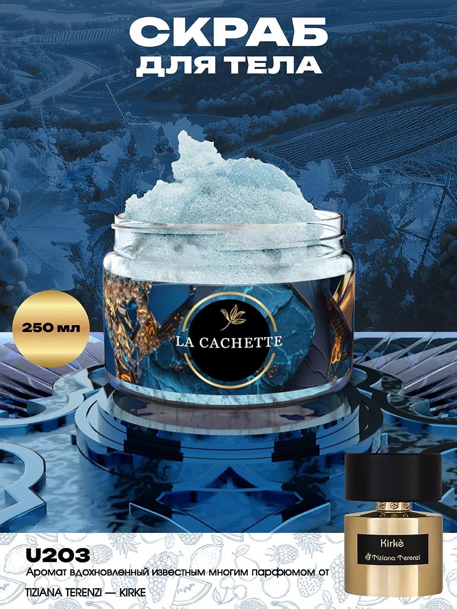 La Cachette U203 Kirke Perfumed Body Scrub, 250 ml. This gentle salt scrub with Kirke perfume from Tiziana Terenzi combines the properties of a scrub and a moisturizer. It promotes better penetration of active ingredients from subsequent skincare products, such as masks or creams. Designed for deep cleansing of the skin, removing dead skin cells, getting rid of impurities, and reducing oiliness. The cream moisturizes the skin, leaving it soft and smooth. Sea salt is used as an abrasive. An immediate effect after the first use: the skin becomes smoother, fresher, and more radiant. Ingredients: Sea salt, glycerin, stearic acid, sodium coco-sulfate, EDTA, methylcloroisin, methylisolone, fragrance. Directions for use: Take a small amount of scrub, distribute evenly over damp skin with light massage movements, and rinse with water. Use 2-3 times a week. This product is made with high-quality, premium ingredients. Notes include pear, blackcurrant leaf, raspberry, passionfruit, peach, lily of the valley, vanilla, heliotrope, musk, patchouli, and sandalwood.