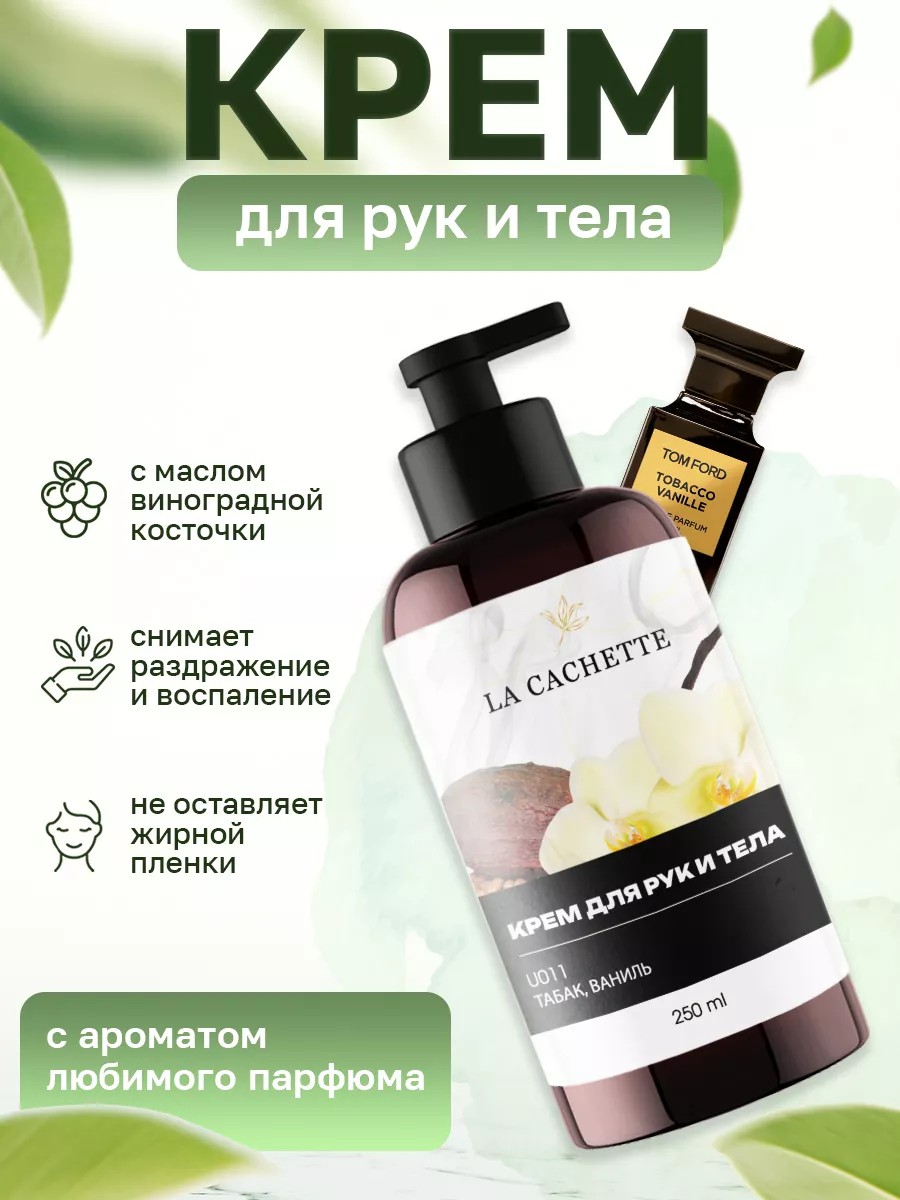 Крем для рук и тела U011 по мотивам Tobacco Vanille от Tom Ford. Крем предназначен для ухода за кожей. Питает и восстанавливает кожу, защищает её о неблагоприятного воздействия негативных факторов: химических веществ раздражающего действия, пониженных температур, частого мытья, ветра, снега и др. Гипоаллергенно. Не содержит вредных компонентов. Легко наносится на кожу и быстро впитывается. Подходит для чувствительной кожи, может применяться для кожи лица. При регулярном применении крем способствует сохранению естественной защитной функции кожи. Входящие в состав комплекс витаминов Е, Д-пантенол успокаивают кожу и устраняют раздражение. Способ применения: Необходимое количество крема нанести на чистую, сухую кожу рук (особое внимание уделить местам около ногтей, между пальцами, тыльной стороне рук). Использовать перед началом работы и после каждого мытья рук. Меры предосторожности: только для наружного применения. Избегать попадания в глаза. В случае попадания – тщательно промыть водой. Состав: Вода, цетеариловый спирт, вазелиновое масло, аллантоин, цетеарет-20, глицерил моностеарат, эмульсионный воск, пантенол, мяты перечной эфирное масло, масло виноградных косточек, парфюмерная отдушка, феноксиэтанол. Присутствуют ноты: Лист тaбaка и Пряности, Ваниль, Какао, Бобы тонка и Цветок тaбaка, Сухофрукты и Древесные ноты... .. Том Форд, Табако Тобакко Ваниль, табако ваниль, Табак ваниль