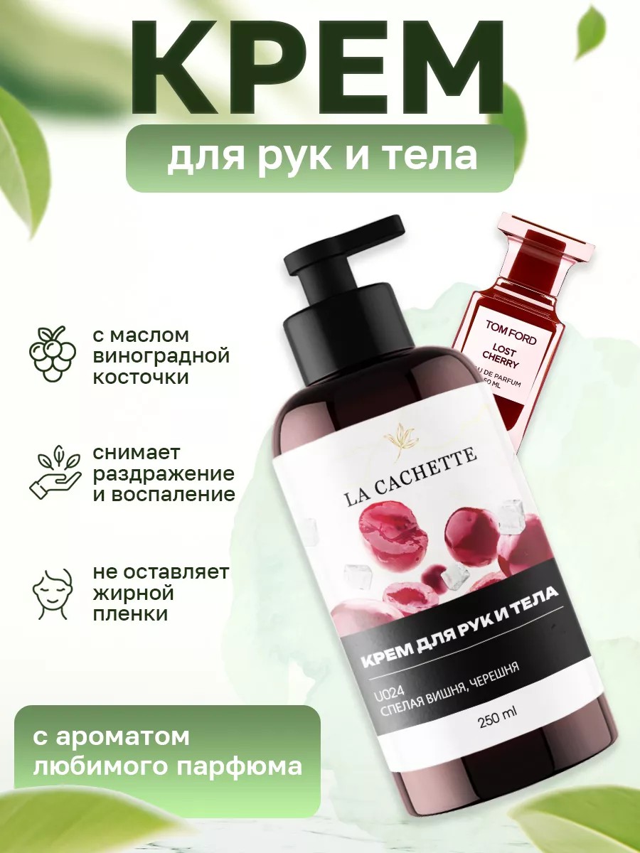 Крем для рук и тела U024 по мотивам Lost Cherry от Tom Ford. Крем предназначен для ухода за кожей. Питает и восстанавливает кожу, защищает её о неблагоприятного воздействия негативных факторов: химических веществ раздражающего действия, пониженных температур, частого мытья, ветра, снега и др. Гипоаллергенно. Не содержит вредных компонентов. Легко наносится на кожу и быстро впитывается. Подходит для чувствительной кожи, может применяться для кожи лица. При регулярном применении крем способствует сохранению естественной защитной функции кожи. Входящие в состав комплекс витаминов Е, Д-пантенол успокаивают кожу и устраняют раздражение. Способ применения: Необходимое количество крема нанести на чистую, сухую кожу рук (особое внимание уделить местам около ногтей, между пальцами, тыльной стороне рук). Использовать перед началом работы и после каждого мытья рук. Меры предосторожности: только для наружного применения. Избегать попадания в глаза. В случае попадания – тщательно промыть водой. Состав: Вода, цетеариловый спирт, вазелиновое масло, аллантоин, цетеарет-20, глицерил моностеарат, эмульсионный воск, пантенол, мяты перечной эфирное масло, масло виноградных косточек, парфюмерная отдушка, феноксиэтанол. Присутствуют ноты: чёрная вишня, вишнёвый ликёр и горький миндаль, вишня гриот, турецкая роза и жасмин самбак, перуанский бальзам, обжаренные бобы тонка, сандал, ветивер и белый кедр... .. Том Форд, Лост Черри