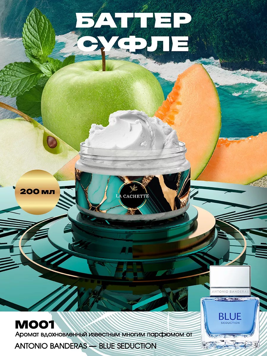 Парфюмированный крем для рук и тела La Cachette одновременно увлажнит и окутает вашу кожу легким шлейфом аромата Blue Seduction от Antonio Banderas. Масло Ши помогает восполнить недостаток питательных веществ во всех слоях дермы и эпидермиса. Формула крем-баттера мгновенно устраняет сухость и шелушения, восстанавливает нормальный гидролипидный барьер, сохраняя эффект увлажнения на длительное время. Продукция создана с использованием высококачественных компонентов премиального качества. Присутствуют ноты: Дыня, Бергамот, Мята и Черная смородина, Морская вода, Зеленое яблоко, Каппуччино, Кардамон и Мускатный орех, Древесные ноты и Амбра. Состав: натуральные масла 99% (масло ши, масло манго, масло авокадо), парфюмерная отдушка. Способ применения: массажными движениями нанести небольшое количество баттера на кожу до полного впитывания. Применять можно в любое время дня по необходимости.