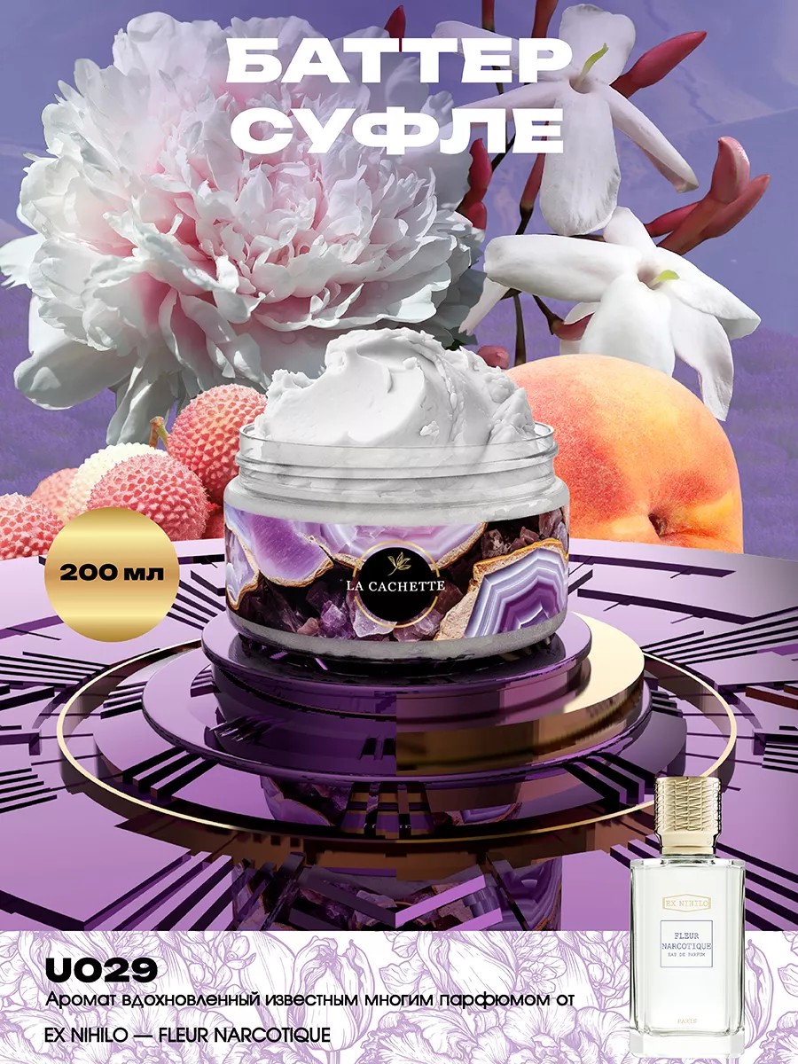 Парфюмированный крем для рук и тела La Cachette одновременно увлажнит и окутает вашу кожу легким шлейфом аромата Fleur Narcotique от Ex Nihilo. Масло Ши помогает восполнить недостаток питательных веществ во всех слоях дермы и эпидермиса. Формула крем-баттера мгновенно устраняет сухость и шелушения, восстанавливает нормальный гидролипидный барьер, сохраняя эффект увлажнения на длительное время. Продукция создана с использованием высококачественных компонентов премиального качества. Присутствуют ноты: личи, бергамот и персик, пион, цветок апельсина, жасмин и петалия, мускус, мох и древесные ноты. Состав: натуральные масла 99% (масло ши, масло манго, масло авокадо), парфюмерная отдушка. Способ применения: массажными движениями нанести небольшое количество баттера на кожу до полного впитывания. Применять можно в любое время дня по необходимости.