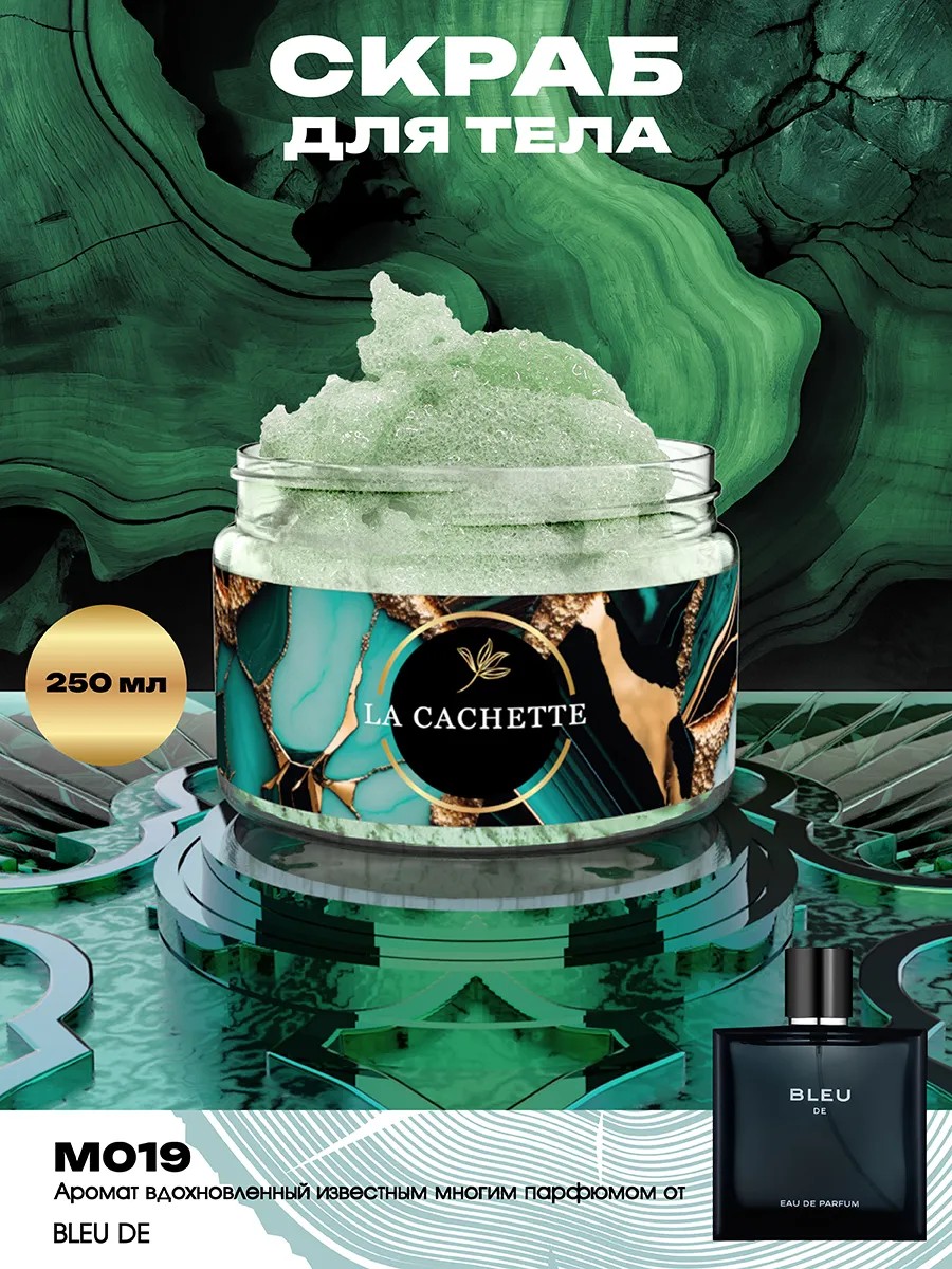La Cachette M019 Bleu de Perfumed Body Cream Scrub, 250 ml. This gentle salt scrub with Bleu de perfume combines the properties of a scrub and a moisturizer. It promotes better penetration of active ingredients from subsequent skincare products, such as masks or creams. Designed for deep cleansing of the skin, removing dead skin cells, getting rid of impurities, and reducing oiliness. The cream moisturizes the skin, leaving it soft and smooth. Sea salt is used as an abrasive. An immediate effect after the first use: the skin becomes smoother, fresher, and more radiant. Ingredients: Sea salt, glycerin, stearic acid, sodium coco-sulfate, EDTA, methylcloroisin, methylisolone, fragrance. Directions for use: Take a small amount of scrub, distribute evenly over damp skin with light massage movements, and rinse with water. Use 2-3 times a week. This product is formulated with high-quality, premium ingredients. Notes include: citrus, vetiver, pink pepper, cedar, grapefruit, woodsy notes, sandalwood, ginger, and incense.