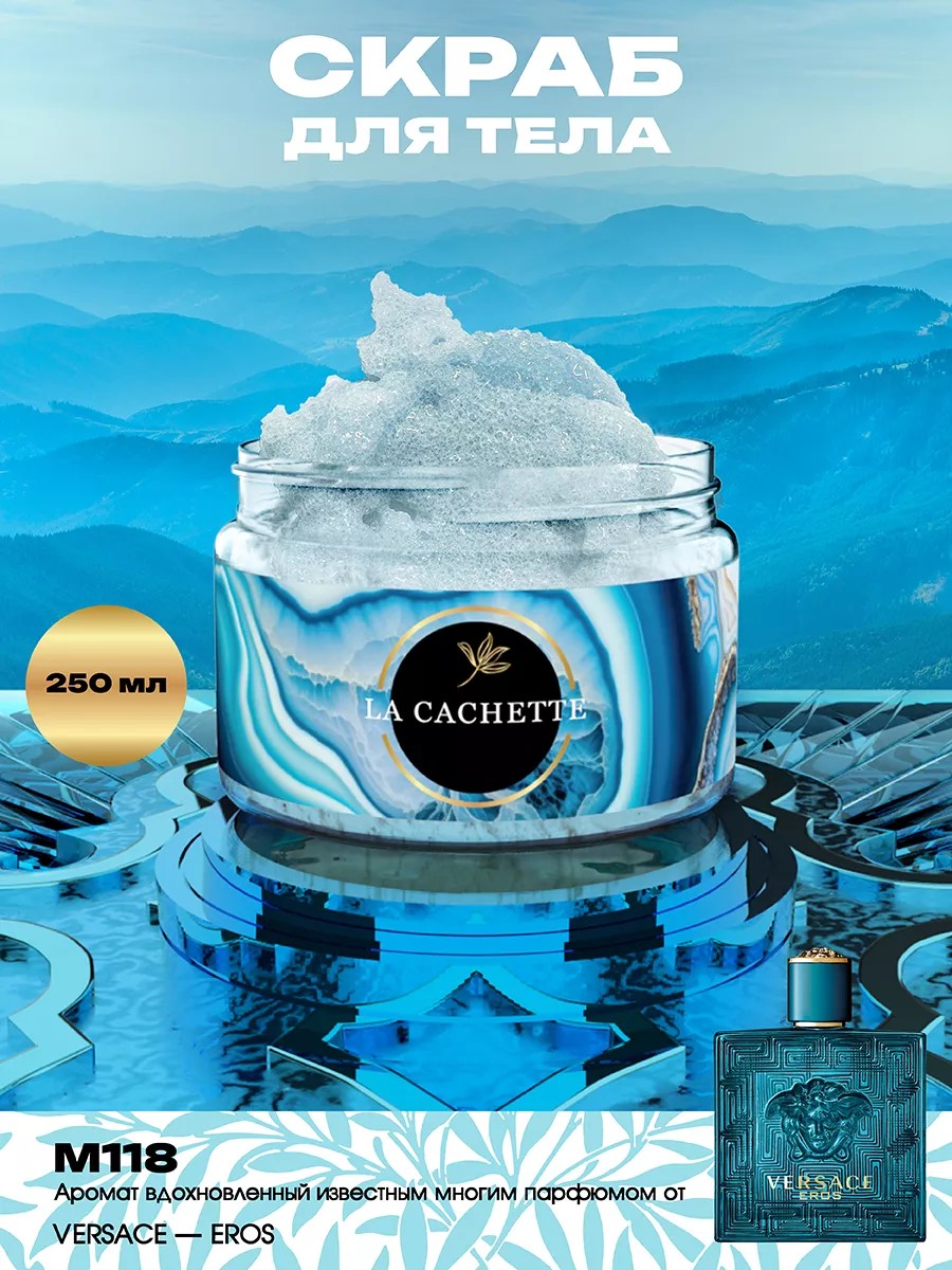 Крем-скраб для тела парфюмированный La Cachette M118 Eros, 250 мл. Нежный солевой скраб с парфюмерной отдушкой Eros от Versace сочетает в себе свойства скраба и увлажняющего крема. Способствует лучшему проникновению активных веществ из последующих уходовых средств, таких как маски или кремы. Предназначен для глубокого очищения кожи, удаления ороговевших клеток, избавления от загрязнений и снижения жирности. Крем увлажняет кожу, делая ее мягкой и гладкой. В качестве абразива используется морская соль. Мгновенный эффект уже после первого применения: кожа становится более гладкой, свежей и сияющей. Состав: Морская соль, глицерин, стеариновая кислота, кокосульфат натрия, EDTA, метилклороизотин, метилизолион, парфюмерная отдушка. Способ применения: Взять небольшое количество скраба, равномерно распределить по влажной коже легкими массажными движениями, смыть водой. Использовать 2-3 раза в неделю. Продукция создана с использованием высококачественных компонентов премиального качества. Присутствуют ноты: мята, зеленое яблоко, лимон, бобы тонка, герань, амброксан, мадагаскарская ваниль, ветивер, дубовый мох, кедр из вирджинии, атласский кедр.