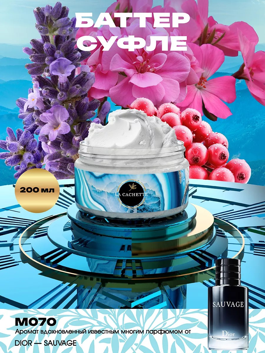 Парфюмированный баттер для тела La Cachette одновременно увлажнит и окутает вашу кожу легким шлейфом аромата Sauvage от Christian Dior. Масло Ши помогает восполнить недостаток питательных веществ во всех слоях дермы и эпидермиса. Формула крем-баттера мгновенно устраняет сухость и шелушения, восстанавливает нормальный гидролипидный барьер, сохраняя эффект увлажнения на длительное время. Продукция создана с использованием высококачественных компонентов премиального качества. Присутствуют ноты: калабрийский бергамот и перец, сычуанский перец, лаванда, розовый перец, ветивер, пачули, герань и элеми, амброксан, кедр и лабданум. Состав: натуральные масла 99% (масло ши, масло манго, масло авокадо), парфюмерная отдушка. Способ применения: массажными движениями нанести небольшое количество баттера на кожу до полного впитывания. Применять можно в любое время дня по необходимости.