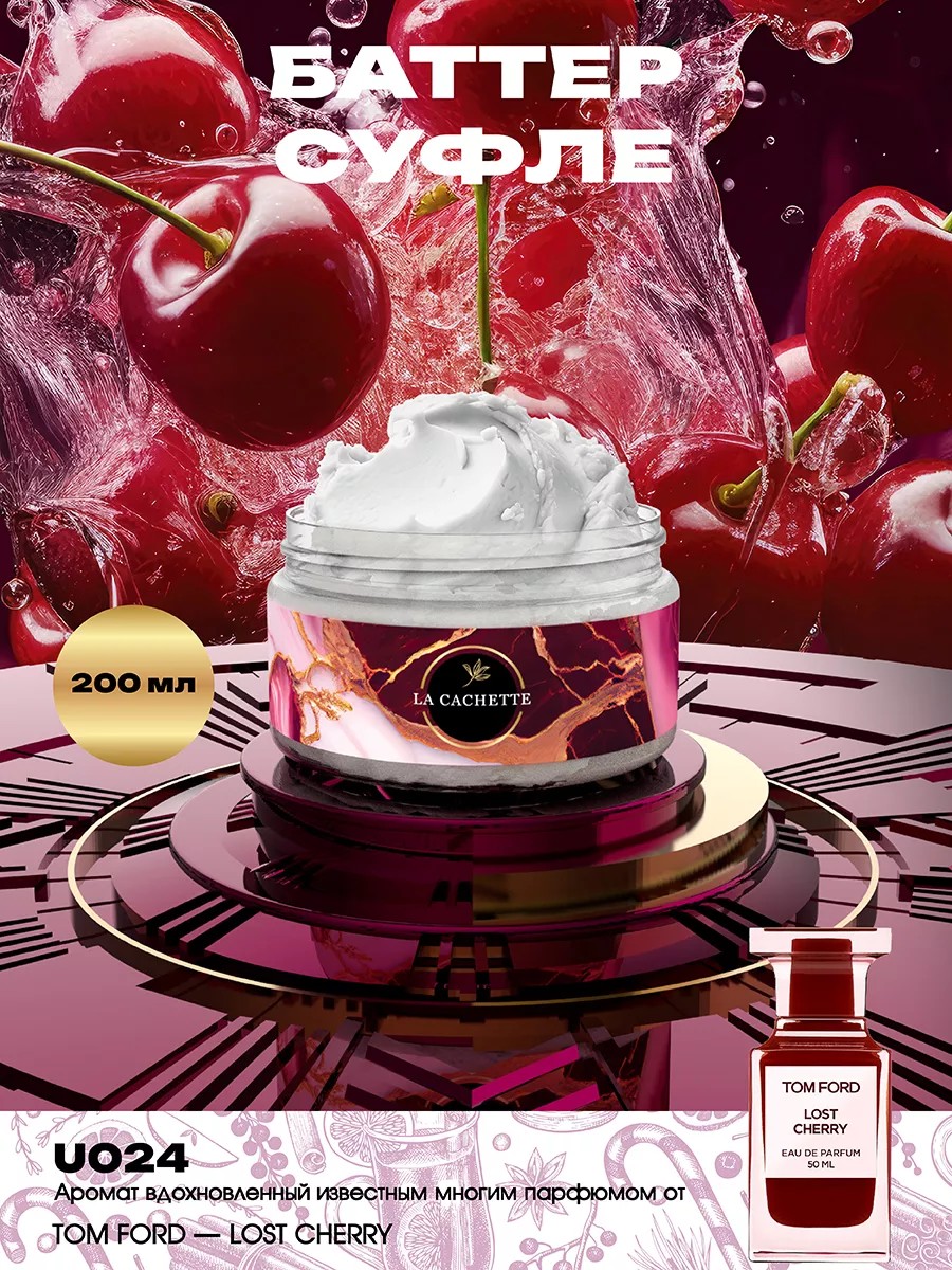 Парфюмированный баттер для тела La Cachette одновременно увлажнит и окутает вашу кожу легким шлейфом аромата Lost Cherry от Tom Ford. Масло Ши помогает восполнить недостаток питательных веществ во всех слоях дермы и эпидермиса. Формула крем-баттера мгновенно устраняет сухость и шелушения, восстанавливает нормальный гидролипидный барьер, сохраняя эффект увлажнения на длительное время. Продукция создана с использованием высококачественных компонентов премиального качества. Присутствуют ноты: чёрная вишня, вишнёвый ликёр и горький миндаль, вишня гриот, турецкая роза и жасмин самбак, перуанский бальзам, обжаренные бобы тонка, сандал, ветивер и белый кедр. Состав: натуральные масла 99% (масло ши, масло манго, масло авокадо), парфюмерная отдушка. Способ применения: массажными движениями нанести небольшое количество баттера на кожу до полного впитывания. Применять можно в любое время дня по необходимости.