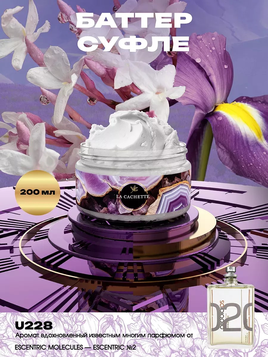 Парфюмированный баттер для тела La Cachette одновременно увлажнит и окутает вашу кожу легким шлейфом аромата Escentric 02. Масло Ши помогает восполнить недостаток питательных веществ во всех слоях дермы и эпидермиса. Формула крем-баттера мгновенно устраняет сухость и шелушения, восстанавливает нормальный гидролипидный барьер, сохраняя эффект увлажнения на длительное время. Продукция создана с использованием высококачественных компонентов премиального качества. Присутствуют ноты: Жасмин, ирис, ветивер, экстракт бузины, амброксан. Состав: натуральные масла 99% (масло ши, масло манго, масло авокадо), парфюмерная отдушка. Способ применения: массажными движениями нанести небольшое количество баттера на кожу до полного впитывания. Применять можно в любое время дня по необходимости.