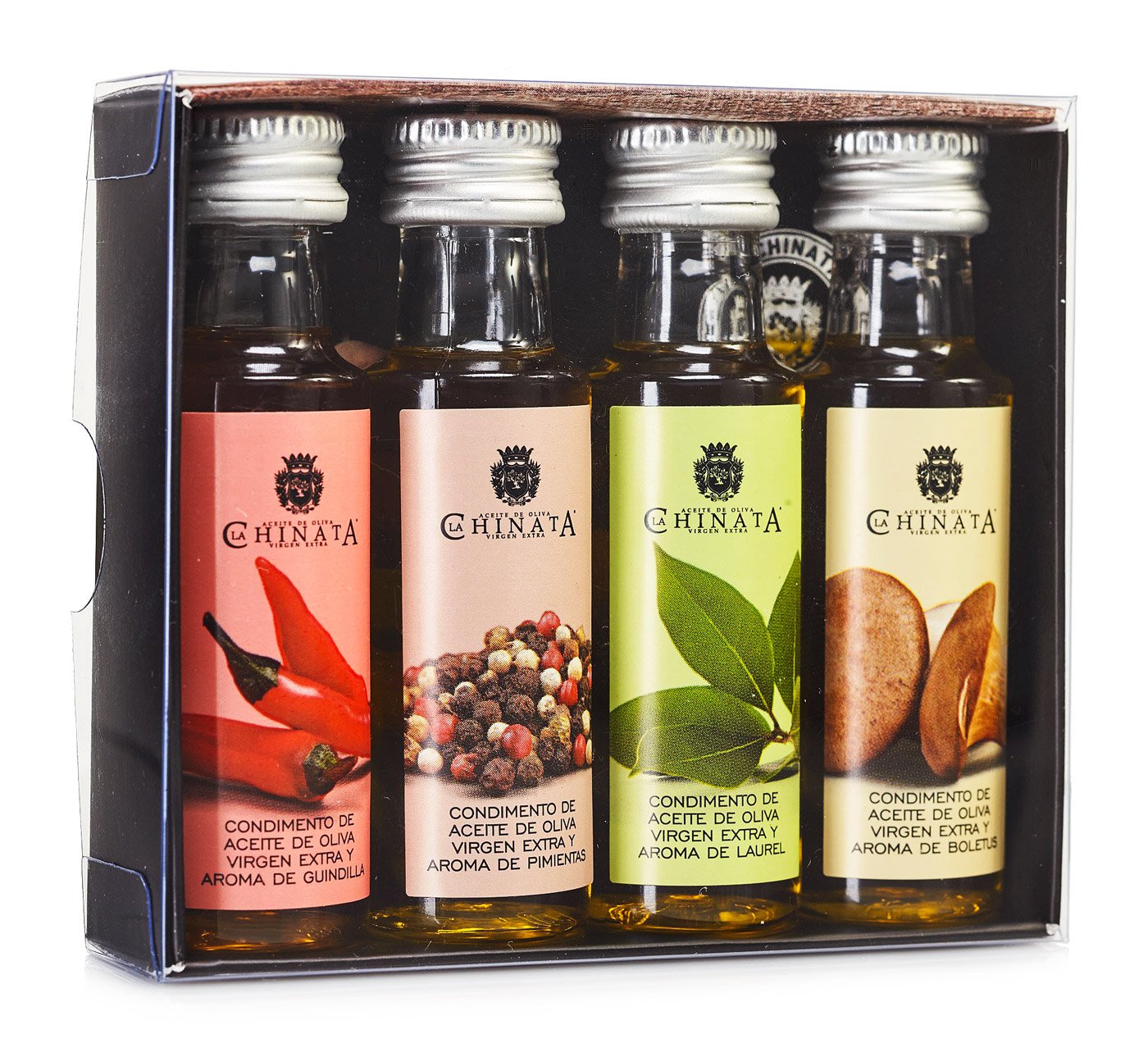This '4 Condiment Set' contains four 25ml bottles of La Chinata flavored olive oils. The set includes the following flavors: Extra Virgin Olive Oil 'Red Chili Pepper', Extra Virgin Olive Oil 'Porcini Mushrooms', Extra Virgin Olive Oil 'Peppercorns', and Extra Virgin Olive Oil 'Bay Leaf'. A complete collection of flavored extra virgin olive oils to add a unique touch to your favorite salad dressings or hot dishes. The bottles are presented in an elegant case, perfect for any kitchen. The condiments are made with La Chinata's finest Extra Virgin Olive Oil and a selection of natural ingredients macerated for over a month using traditional, natural methods. Contents: 4 x 25 ml Ingredients: Extra Virgin Olive Oil (96 ), Dried Chili Pepper (3 ), Flavoring Extra Virgin Olive Oil (97.2 ), Flavoring, Dried Porcini Mushrooms (1.3 ) Extra Virgin Olive Oil (94.5 ), Dried Peppers [Black Pepper, Pink Pepper] (4 ), Flavoring Extra Virgin Olive Oil (97.3 ), Flavoring, Dried Bay Leaf (1.2 ) INSTRUCTIONS FOR USE Add to salads or hot dishes to give them a different touch. Store in a cool, dry place.Huile d'Olive Vierge Extra '4 Condiments' (4 x 25 ml) - La ChinataDESCRIPTION DU PRODUIT DESCRIPTION DU PRODUIT Cet 'Étui 4 Condiments' contient quatre bouteilles de 25 ml d'huiles condimentées de La Chinata. L'étui contient les goûts suivants: Huile d'Olive Vierge Extra 'Piment Rouge' Huile d'Olive Vierge Extra 'Cèpes' Huile d'Olive Vierge Extra 'Poivres' Huile d'Olive Vierge Extra 'Laurier' Une collection complète d'huiles d'olives vierge extra aromatisées pour donner une touche différente aux assaisonnements de vos salades favorites ou à vos plats chauds. Les bouteilles sont présentées dans un étui élégant et il est parfait dans n'importe quelle cuisine. Les condiments sont élaborés avec la meilleure Huile d'Olive Vierge Extra de La Chinata, et une sélection de produits naturels macérés pendant plus d'un mois en suivant des méthodes traditionnelles et naturelles. Contenu: 4 x 25 ml Ingrédients: Huile d'Olive Vierge Extra (96 ),Piment Déshydraté (3 ), Arôme Huile d'Olive Vierge Extra (97,2 ), Arôme, Cèpes Déshydraté (1,3 ) Huile d'Olive Vierge Extra (94,5 ), Poivres Déshydratés [Poivre Noir, Poivre Rose] (4 ), Arôme Huile d'Olive Vierge Extra (97,3 ), Arôme, Laurier Déshydraté (1,2 ) MODE D'EMPLOI Ajoutez aux salades ou aux plats chauds pour leur donner une touche différente. Conserver dans un endroit sec et frais.