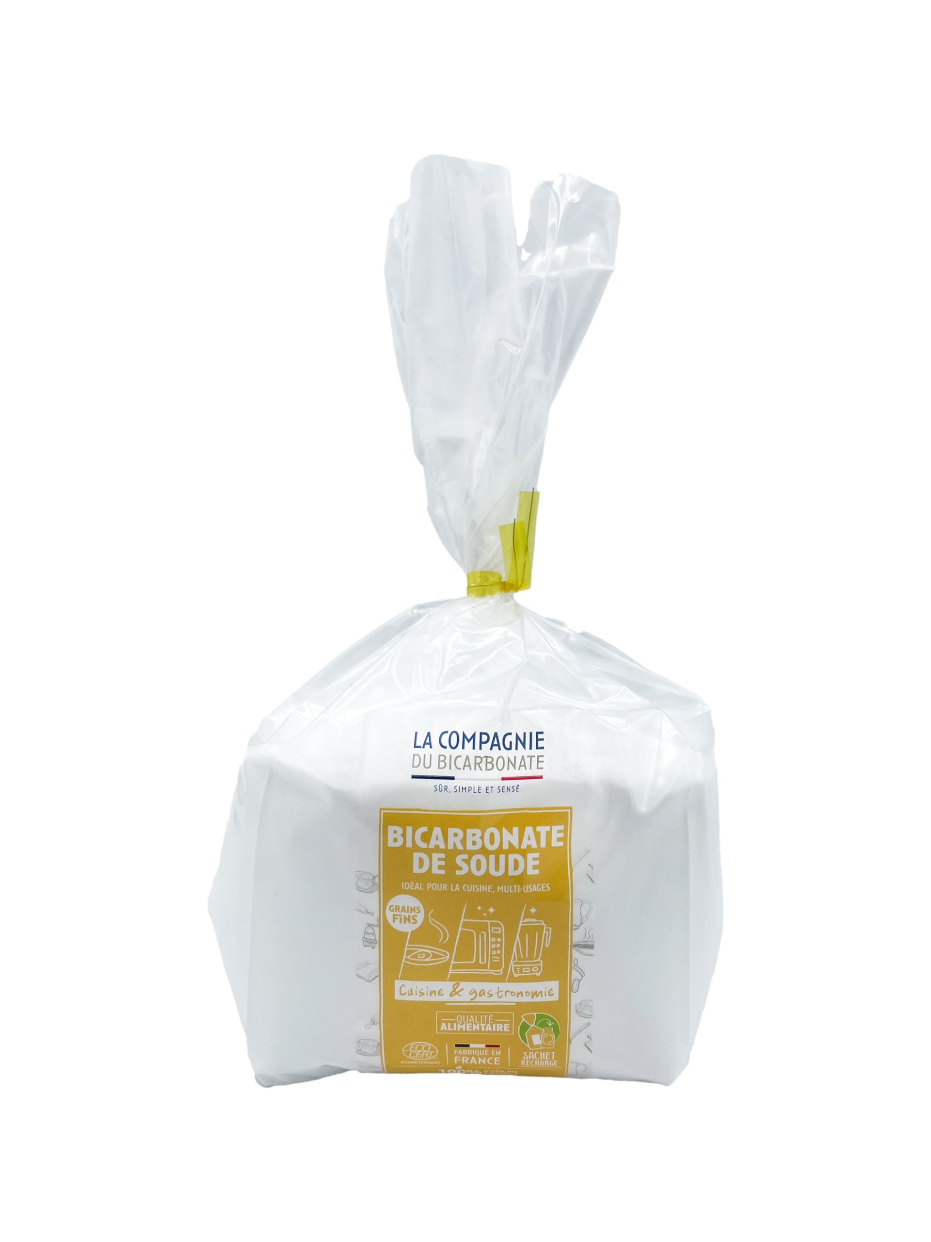 Our 1kg bag of food-grade bicarbonate has an "Open-up" opening to make it easy to refill your bottles. Depending on its grain size, bicarbonate of soda is multi-purpose and contributes to your daily household chores as well as your well-being. Extra-fine bicarbonate contributes to all your DIY cosmetic creations. Fine bicarbonate is ideal for cleaning your pool and accompanying you in the kitchen. And coarse-grained bicarbonate will be perfect for getting rid of dirt with a damp sponge! INGREDIENTS Sodium bicarbonateLa Compagnie du Bicarbonate - Specializing in the manufacture of sodium bicarbonate, we have extended our expertise to products based on other simple and natural raw materials by combining: practicality, economy and preservation of health and the environment. Our goal is to transform your daily life with practical and natural products!. Made in France - We favor local production by collaborating with SMEs close to us to guarantee a committed, ecological and local approach. Thanks to our eco-responsible, natural and effective products you will become eco-citizens yourself without even realizing it!. Many Benefits - Food grade baking soda guarantees effective action to raise your pastries, reduce the acidity of vegetables or even tenderize meats. Sodium bicarbonate has anti-odor properties and also helps eliminate stains, remove traces of mold and make your sink shine. A Multi-Purpose Ally - Food grade baking soda is known for its multi-actions that vary depending on its granulometry (cleaning, laundry, well-being, etc.). Fine baking soda is ideal for accompanying you in your culinary preparations, cleaning your pool or even helping to restore water with effective treatment. It is the most versatile ecological element!. Fine Food Grade Baking Soda - Our food grade baking soda in 1kg "Open Up" sachets is a practical and ecological solution for refilling your bottle and meeting all your needs. This food grade sodium bicarbonate is finely sieved for a multi-purpose function on a daily basis. Notre sac de bicarbonate alimentaire de 1kg est doté de l'ouverture "Open-up" pour faciliter la recharge de vos flacons. Selon sa granulométrie, le bicarbonate de soude est multi-usages et participe à vos tâches ménagères quotidiennes ainsi qu'à votre bien-être. Le bicarbonate extra-fin participe à toutes vos créations DIY cosmétiques. Le bicarbonate fin est idéal pour nettoyer votre piscine et vous accompagner en cuisine. Et le bicarbonate à gros grains sera parfait pour vous débarasser de la saleté grâce à une éponge humide ! INGRÉDIENTS Bicarbonate de soudeLa Compagnie du Bicarbonate - Spécialisés dans la fabrication de bicarbonate de sodium, nous avons étendu notre expertise aux produits à base d'autres matières premières simples et naturelles en alliant : praticité, économie et préservation de la santé et de l'environnement. Notre objectif étant transformer votre quotidien avec des produits pratiques et naturels !. Fabriqué En France - Nous privilégions une production locale en collaborant avec des PME proches de chez nous pour garantir une démarche engagée, écologique et de proximité. Grâce à nos produits éco-responsables, naturels et efficaces vous deviendrez vous-mêmes écocitoyens sans même vous en rendre compte !. De Nombreux Avantages - Le bicarbonate de soude alimentaire garantit une action efficace pour lever vos pâtisseries, réduire l'acidité des légumes ou encore attendrir les viandes. Le bicarbonate de sodium a des propriétés anti-odeurs et permet également d'éliminer les taches, d'enlever les traces de moisissures et faire briller votre évier. Un Allié Multi-Usages - Le bicarbonate de soude alimentaire est connu pour ses multi actions qui varient selon sa granulométrie (ménage, linge, bien-être.). Le bicarbonate soude Fin est idéal pour vous accompagner dans vos préparations culinaires, nettoyer votre piscine ou encore aider à retrouver une eau avec un traitement efficace. C'est l'élément écologique le plus polyvalent !. Bicarbonate Alimentaire Fin - Notre bicarbonate de soude alimentaire en sachet de 1kg "Open Up" est une solution pratique et écologique pour recharger votre flacon et répondre à tous vos besoins. Ce bicarbonate de sodium alimentaire est tamisé fin pour une fonction multi-usages au quotidien.
