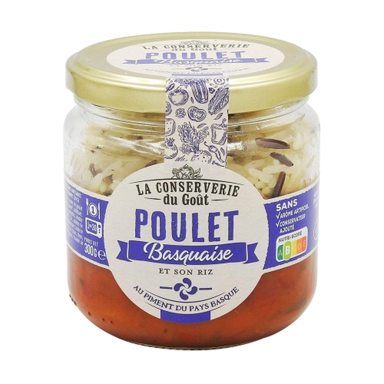 Discover the delicious Basque Chicken from La Conserverie du Goût, a traditional Basque Country recipe made with tender and flavorful pieces of chicken, simmered with peppers, onions, tomatoes, and spices. This 300g jar contains an explosion of Mediterranean flavors and offers a comforting and convivial dish. Ingredients: Precooked white rice 25 , precooked cured chicken meat 25 (chicken meat , acidity regulator: sodium citrate, salt), peppers, water, zucchini, double concentrated tomato paste, precooked wild rice 1.5 , corn starch, extra virgin olive oil, dehydrated onions, rapeseed oil, salt, sugar, garlic powder, white wine extract, thyme, Basque chili pepper 0.03 , spice extract. Chicken meat from the European Union Allergens: Storage instructions: Store at room temperature, away from heat and humidity, before opening. Preparation instructions: To enjoy Basque-style Chicken, simply warm the contents of the jar in a bain-marie or microwave, then serve hot. This flavorful dish can be garnished with fresh parsley or Espelette pepper for a spicier touch. Product Information: Net Weight: 300g Origin: France Energy: 478kJ 114kcal Fat: 3.9g, of which saturates 0.9g Carbohydrate: 13g, of which sugars 1.9g Protein: 6.3g Dietary Fiber: 0.7g Salt: 0.72g Packaging: Glass Jar Full details are available on the product packaging. The information on this page is for guidance only. We encourage you to read the information on the product label, especially regarding food allergies. INGREDIENTS Precooked white rice 25 , precooked cured chicken 25 (chicken , acidity regulator: sodium citrate, salt), bell peppers, water, zucchini, double concentrated tomato paste, precooked wild rice 1.5 , corn starch, extra virgin olive oil, dehydrated onions, rapeseed oil, salt, sugar, garlic powder, white wine extract, thyme, Basque chili pepper 0.03 , spice extract. Chicken meat origin: European Union SAFETY WARNING Full details are available on the product packaging. The information on this page is for guidance only. We encourage you to read the product label, especially regarding food allergies. See morePoulet basquaise riz - Bocal 300g 1 Unité (Lot de 1)DESCRIPTION DU PRODUIT DESCRIPTION DU PRODUIT Découvrez le délicieux Poulet basquaise de La Conserverie du Goût, une recette traditionnelle du Pays Basque à base de morceaux de poulet tendres et savoureux, mijotés avec des poivrons, des oignons, des tomates et des épices. Ce bocal de 300g renferme une explosion de saveurs méditerranéennes et offre un plat réconfortant et convivial. Ingrédients : Riz blanc précuit 25 , viande de poulet traitée en salaison précuite 25 (viande de poulet , acidifiant : citrate de sodium, sel), poivrons, eau, courgettes, double concentré de tomates, riz sauvage précuit 1,5 , amidon de maïs, huile d'olive vierge extra, oignons déshydratés, huile de colza, sel, sucre, ail en poudre, extrait de vin blanc, thym, piment du pays basque 0,03 , extrait d'épices. Viande de poulet origine Union Européenne Allergènes : Mode de conservation : A conserver à température ambiante, à l'abri de la chaleur et de l'humidité avant ouverture. Conseil d'utilisation : Pour déguster le Poulet basquaise, il suffit de réchauffer le contenu du bocal au bain-marie ou au micro-ondes, puis de le servir chaud. Ce plat savoureux peut être agrémenté de persil frais ou de piment d'Espelette pour une touche plus relevée. Informations produit : Poids net : 300g Origine : France Energie : 478KJ 114Kcal Lipides : 3,9g dont acides gras saturés 0,9g Glucides : 13g dont sucres 1,9g Protéines : 6,3g Fibres alimentaires : 0,7g Sel : 0,72g Emballage : Bocal en Verre Détail complet et disponible sur l'emballage du produit. Les informations présentes sur cette page sont à titre indicatif. Nous vous invitons à prendre connaissance des informations sur l'étiquette du produit, en particulier concernant les allergies alimentaires. INGRÉDIENTS Riz blanc précuit 25 , viande de poulet traitée en salaison précuite 25 (viande de poulet , acidifiant : citrate de sodium, sel), poivrons, eau, courgettes, double concentré de tomates, riz sauvage précuit 1,5 , amidon de maïs, huile d'olive vierge extra, oignons déshydratés, huile de colza, sel, sucre, ail en poudre, extrait de vin blanc, thym, piment du pays basque 0,03 , extrait d'épices. Viande de poulet origine Union Européenne AVERTISSEMENT DE SÉCURITÉ Détail complet et disponible sur l'emballage du produit. Les informations présentes sur cette page sont à titre indicatif. Nous vous invitons à prendre connaissance des informations sur l'étiquette du produit, en particulier concernant les allergies alimentaires. Voir plus