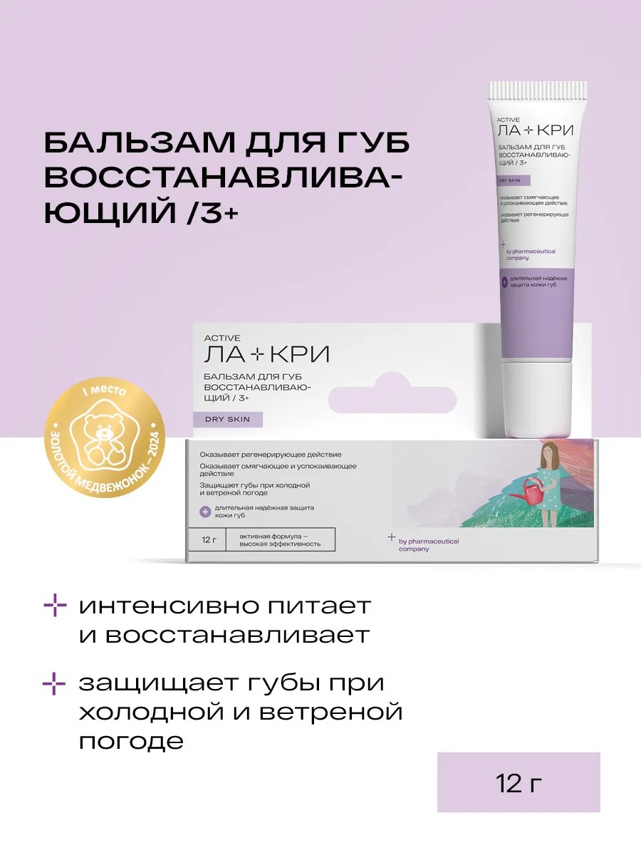 Каждая мама знает, сухость губ у ребенка часто приводит к появлению трещинок и воспалений, поэтому при первых признаках важно как можно быстрее восстановить нежную кожу малыша. Восстанавливающий детский бальзам ЛА-КРИ предназначен для ухода и интенсивного питания очень сухой кожи губ у детей с 3 лет, обеспечивая долгую защиту от агрессивных внешних воздействий. Безопасный негормональный состав на основе натуральных компонентов оказывает экстренную помощь потрескавшимся губам, быстро устраняет дискомфорт при обветривании. Активные лечебные компоненты: экстракт солодки и бисаболол обладают противовоспалительным и успокаивающим действием, а пчелиный воск питательными и смягчающими свойствами. Масло ши, касторовое, миндальное и витамины А и Е способствуют увлажнению и разглаживанию, создавая воздухопроницаемый защитный барьер. Пантенол и ментол оказывают регенерирующее и заживляющее действие. Не рекомендуется при индивидуальной непереносимости компонентов. Легкая увлажняющая текстура не оставляет ощущения липкости. Гигиеническое прозрачное средство можно использовать на ежедневной основе как в дневное, так и в ночное время. Защищает при холодной и ветренной погоде. Наш уходовый гипоаллергенный продукт не содержит отдушек, запаха, красителей и парабенов. Бесцветная гигиеничка подходит также для взрослых и мальчиков и девочек-подростков. Эффективность и безопасность подтверждена клиническими исследованиями. Бренд Ла-Кри - это аптечная косметика, основанная на достижениях современной косметологии и фармакологии.