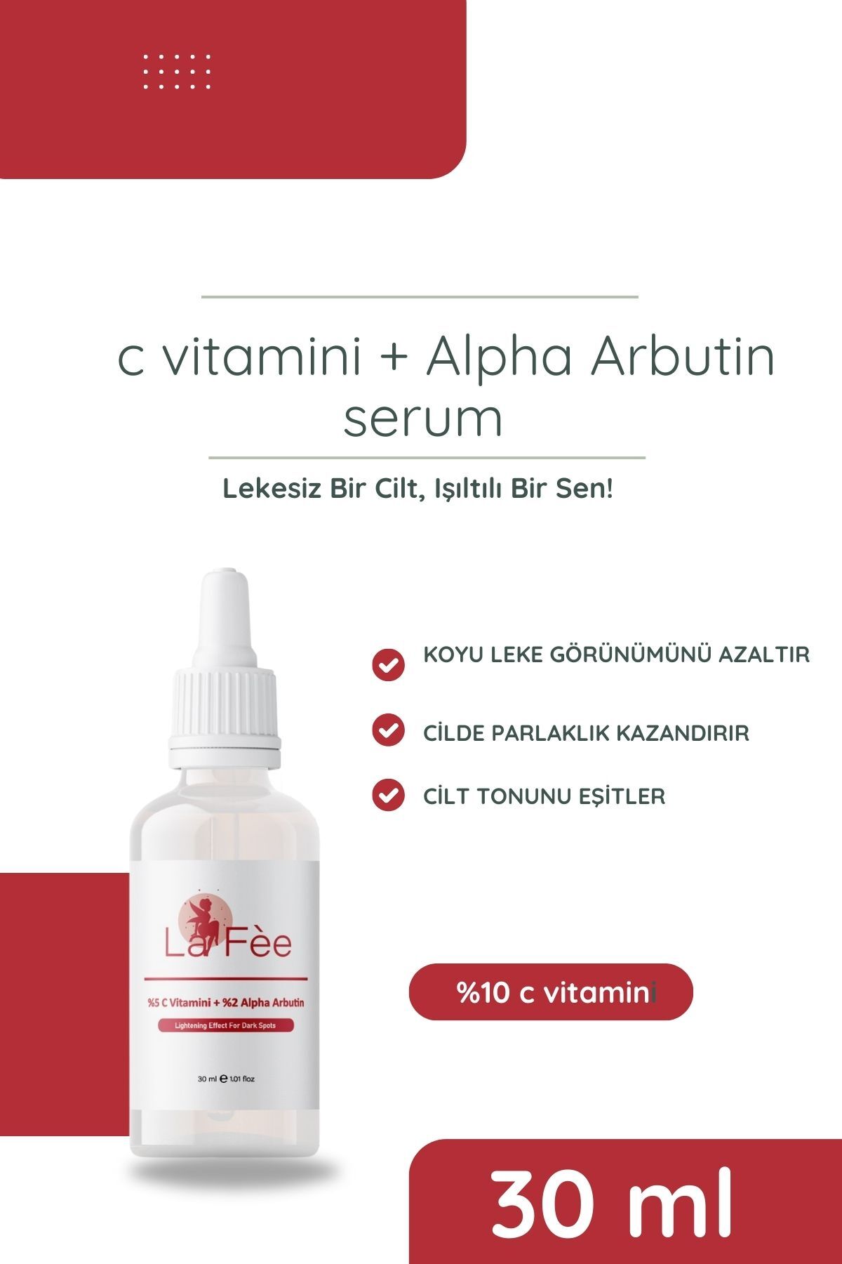 Cildinize aydinlik bir dokunus katin ve koyu lekelere veda edin! La Fée'nin aydinlatici yüz serumu ile cildinizi doganin gücüyle yenileyin.