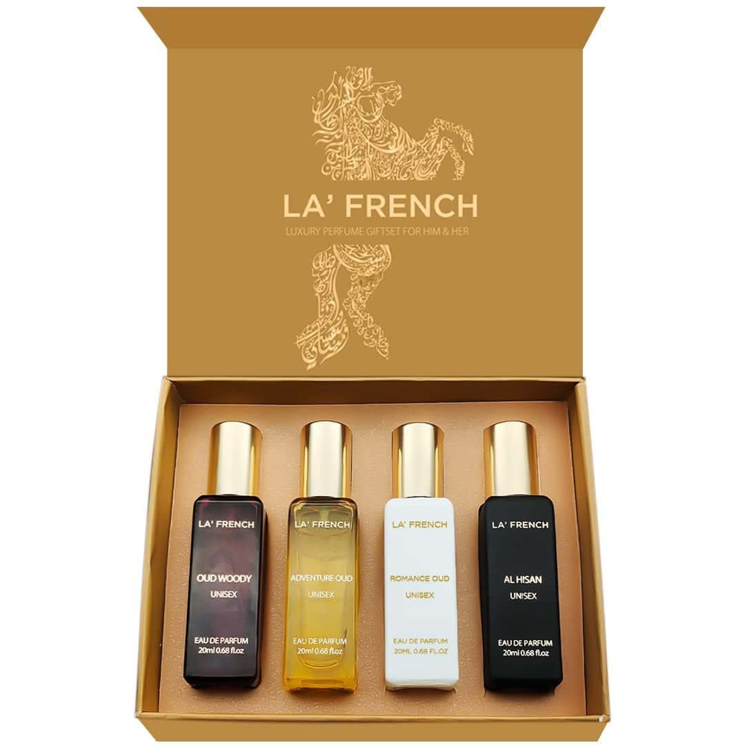 La. French Oudhh Unisex Eau De Parfum Gift Set 4 x 20ml for Men & Women | with Adventure Oud Romance Oud Al Hisan Oud Woody | Eau De Perfume | Rakhi Gift Set For Brother and Sister
