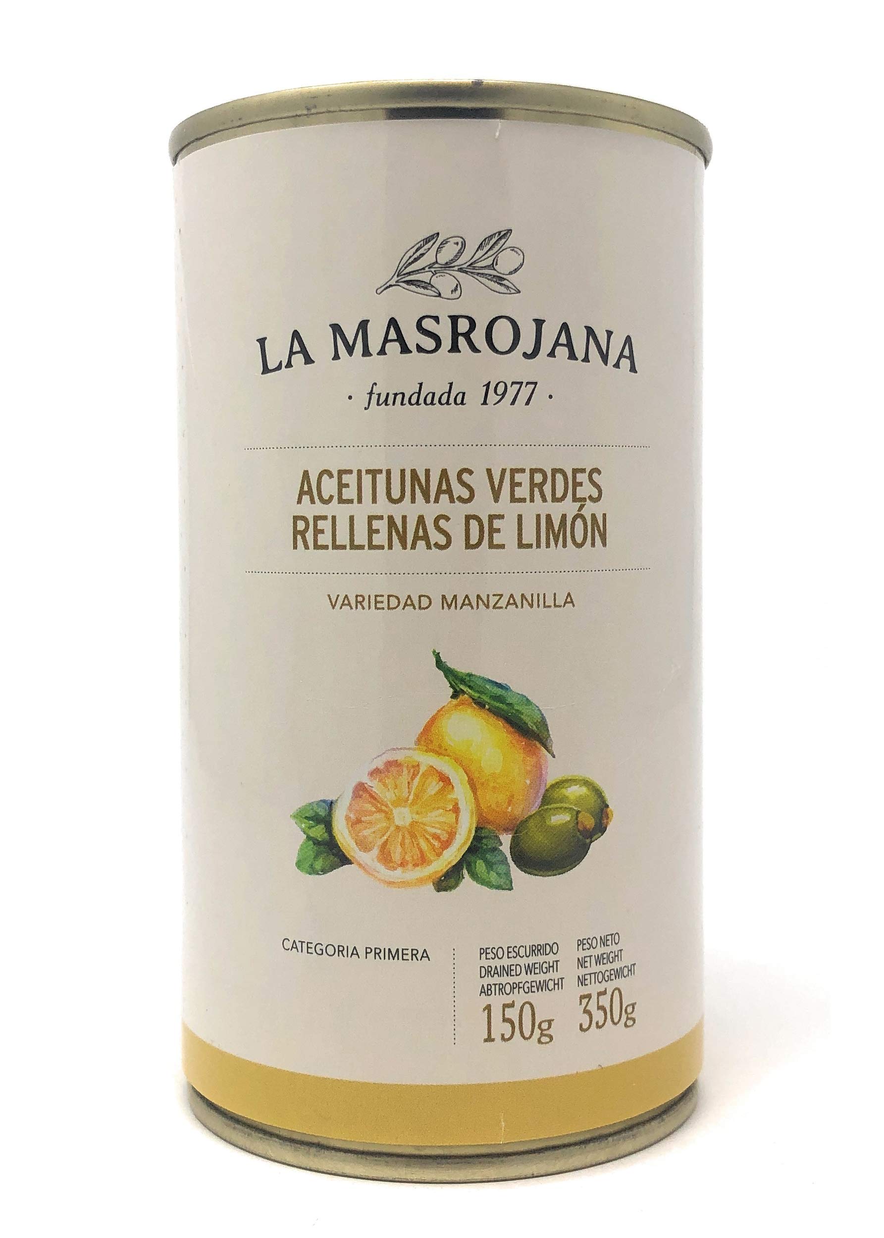 La Masrojana's green Manzanilla olives are filled with lemon - 150g tin of Spanish green Manzanilla olives - Light and filled with fresh, fruity lemon. The lemon filling gives the olives a surprisingly tangy citrus flavor. Served with these orange olives as tapas, they are a true delight. At La Masrojana, everything revolves around the olive. This family business specializes in processing the region's olives. Whether it's encrusted olives, filled olives, delicious aromatic oils, or pâtés: if it tastes good and grows on an olive tree, La Masrojana makes a wonderful product. Product name: Green olives filled with lemon. First class. Pasteurized Product Origin: Spain Responsible Food Company: La Masrojana S.L. with La Verdeguera Parc. C1-C2 Nau 3, 43740 Mora d'Erbe, Tarragona, Spain. Imported by Vinos Barrón, Owner: Annemarie Barrón, Gewerbering 1, 86922 Eresing, Germany Storage: Store in a cool, dry place. Once opened, keep refrigerated and consume within 6 days. Serve chilled. Nutritional Information: 100 g Energy: 165 kcal 680 kJ Fat: 17 g of which saturates 3.1 g Carbohydrate: 0.5 g of which sugars 0 g Protein: 1.5 g Salt: 2.8 g Net weight: 350 g - Drained weight: 150 g More information on the additives used: http: das-ist-drin.de glossar e-numern e621-mononatriumglutamat http: das-ist-drin.de glossar e-numern E300-ascorbinsaeure http: das-ist-drin.de glossar e-numern e401-natriumalginat Ingredients: Demineralized Mazanilla green olives, lemon paste (water, lemon, and stabilizer E-401 (sodium alginate)), salt, mollusk. INGREDIENTS Ingredients: Mazanilla green olives, lemon paste (water, lemon, and stabilizer E-401 (sodium alginate)), salt, flavor enhancer E-621 (monosodium glutamate), acidifier E-330, antioxidant E-300 (ascorbic acid).Olives manzanilla vertes farcies au citron 150g en conserveDESCRIPTION DU PRODUIT DESCRIPTION DU PRODUIT Les olives Manzanilla vertes de la Masjorana sont remplies de citron - Boîte de 150 g d'espagnole et vertes déternies d'olive manzanilla - Légères et remplies de citron frais et fruité. Les olives manzanilla avec un remplissage de citron donnent aux olives un goût d'agrumes acidulé qui est surprenant. Avec les olives d'orange en tant que tapas, ils sont un véritable plaisir. Chez La Masrojana, tout tourne autour de l'olive. L'entreprise familiale s'est spécialisée dans le traitement des olives de la région. Qu'il s'agisse de olives incrustées, d'olives remplies, de délicieuses huiles aromatiques ou de patés : si elle a un bon goût et pousse sur un olivier, la Masrojana en fait un produit agréable. Nom de la route : olives vertes remplies de citron. Première classe commerciale. Produit Pasteurisé Origine : Espagne Entreprise alimentaire responsable : La Masrojana S.L. Avec La Verdeguera Parc. C1-C2 Nau 3, 43740 Mora d'Erbe, Tarragona, Espagne. Importé par Vinos Barrón, Titulaire : Annemarie Barrón, Gewerbering 1, 86922 Eresing, Allemagne Stockage : conserver dans un endroit frais et sec. Après ouverture, conserver au réfrigérateur et consommer dans les 6 jours. Servir au frais. Informations nutritionnelles : 100 g. Valeur énergétique : 165 kcal 680 kJ Graisse : 17 g. dont acides gras saturés 3,1 g. Glucides : 0,5 g. dont sucre 0 g. Protéines : 1,5 g. Sel : 2,8 g. Contenu net : 350 g - Poids égoutté : 150 g. Plus d'informations sur les additifs utilisés : http: das-ist-drin.de glossar e-numern e621-mononatriumglutamat http: das-ist-drin.de glossar e-numern E300-ascorbinsaeure http: das-ist-drin.de glossar e-numern e401-natriumalginat Ingrédients : olives vertes de Mazanilla déminéralisées, pâte de citron (eau, citron et stabilisateur E-401 (alginate de sodium), sel, mue. INGRÉDIENTS Ingrédients: olives de mazanilla vertes, pâte de citron (eau, citron et stabilisateur E-401 (alginate de sodium)), sel, exhausteurs de goût E-621 (glutamate monosodique), acidifiant E-330, antioxydant E-300 (acide ascorbique).