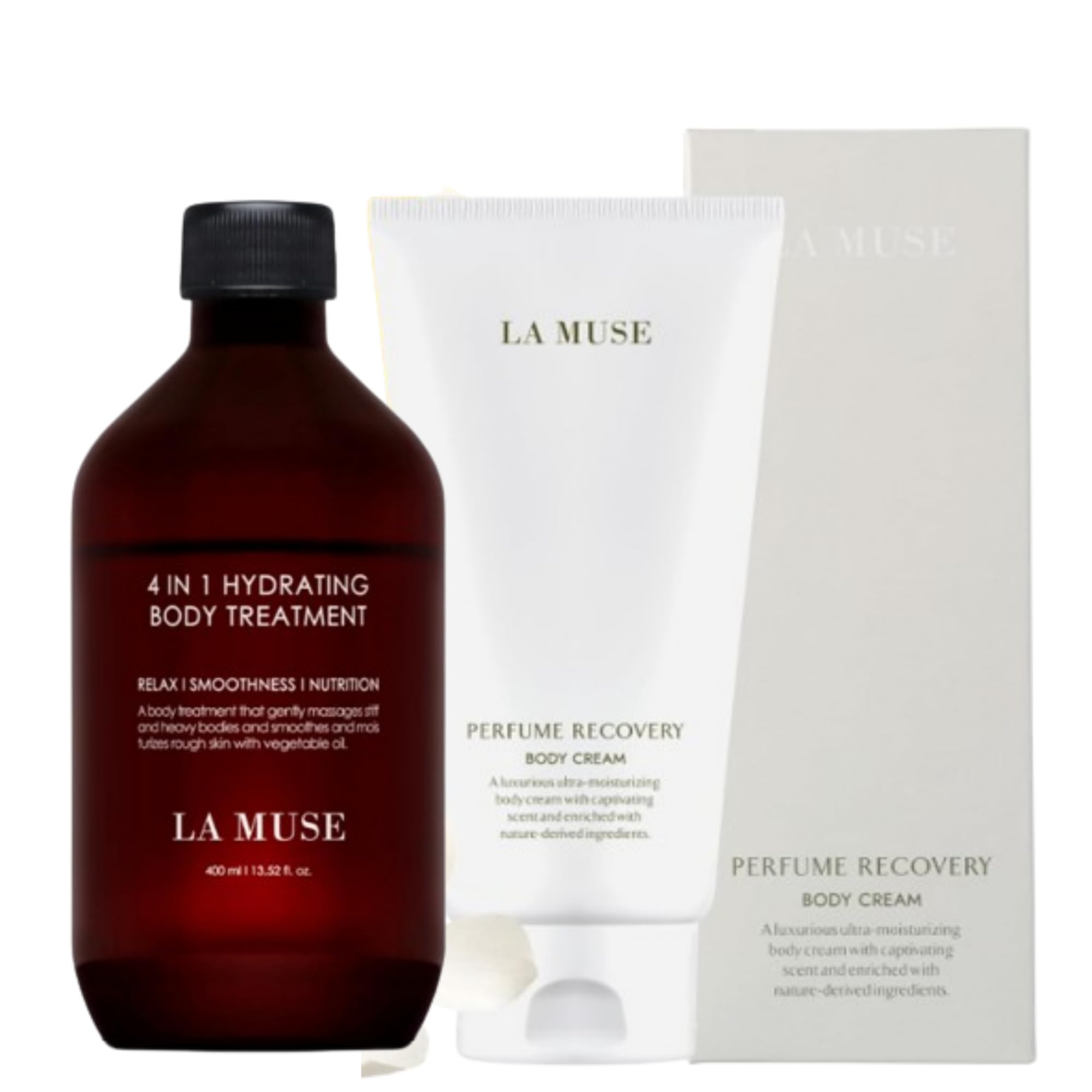 LA MUSE Hydration Recovery Skincare Duo. This set pairs the 4-in-1 Hydrating Body Treatment, which massages, smooths, and deeply hydrates with a calming aromatherapy effect, with the Perfume Recovery Body Cream, enriched with shea butter and peptides to nourish, firm, and protect. Together, they care for dry, sensitive skin, leaving it soft, revitalized, and delicately scented.
