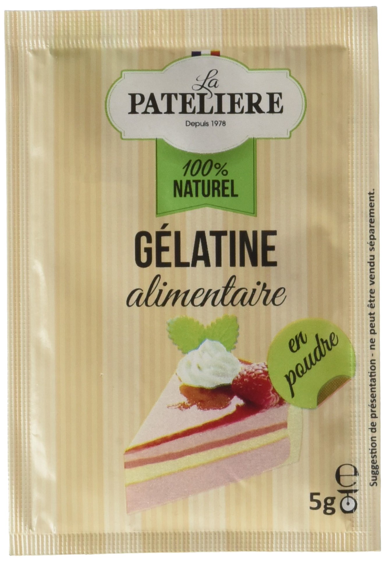 Food gelatin powder 4x5g LA PATELIERE. Easy-to-use powdered gelatin, quick to dilute and quick to set. To gel, thicken, stabilize, and give texture to mousses, Bavarian creams, and panna cotta. The essential pastry complement!. INGREDIENTS Food gelatin of porcine origin (NF V59-001). INSTRUCTIONS FOR USE Use 2 sachets of 5g per half liter of preparation. Pour the contents of the sachet into 2 tablespoons of cold water, stir, and let it swell for 2 to 3 minutes. SAFETY WARNING Baking aid for household use, not intended for consumption as is. To gel, thicken, stabilize, add texture, or add volume. Powdered gelatin, Gold Quality. Pastry supplement and gelling agent. Gélatine alimentaire poudre 4x5g LA PATELIERE. Gélatine en poudre facile d'emploi, dilution rapide et prise rapide. Pour gélifier, épaissir, stabiliser, donner de la texture aux mousses, bavarois, panna cotta. Le complément pâtissier indispensable !. INGRÉDIENTS Gélatine alimentaire d'origine porcine (NF V59-001). MODE D'EMPLOI Utiliser 2 sachets de 5g par demi-litre de préparation. Verser le contenu du sachet dans 2 cuillères à soupe d'eau froide, remuer, laisser gonfler 2 à 3 min. AVERTISSEMENT DE SÛRETÉ Produit d'aide à la pâtisserie à usage ménager, non destiné à être consommé en l'état. Pour gélifier, épaissier, stabiliser, donner de la texture ou donner du volume. Gélatine en poudre, Qualité Or. Complément et gélifiant pâtissier.