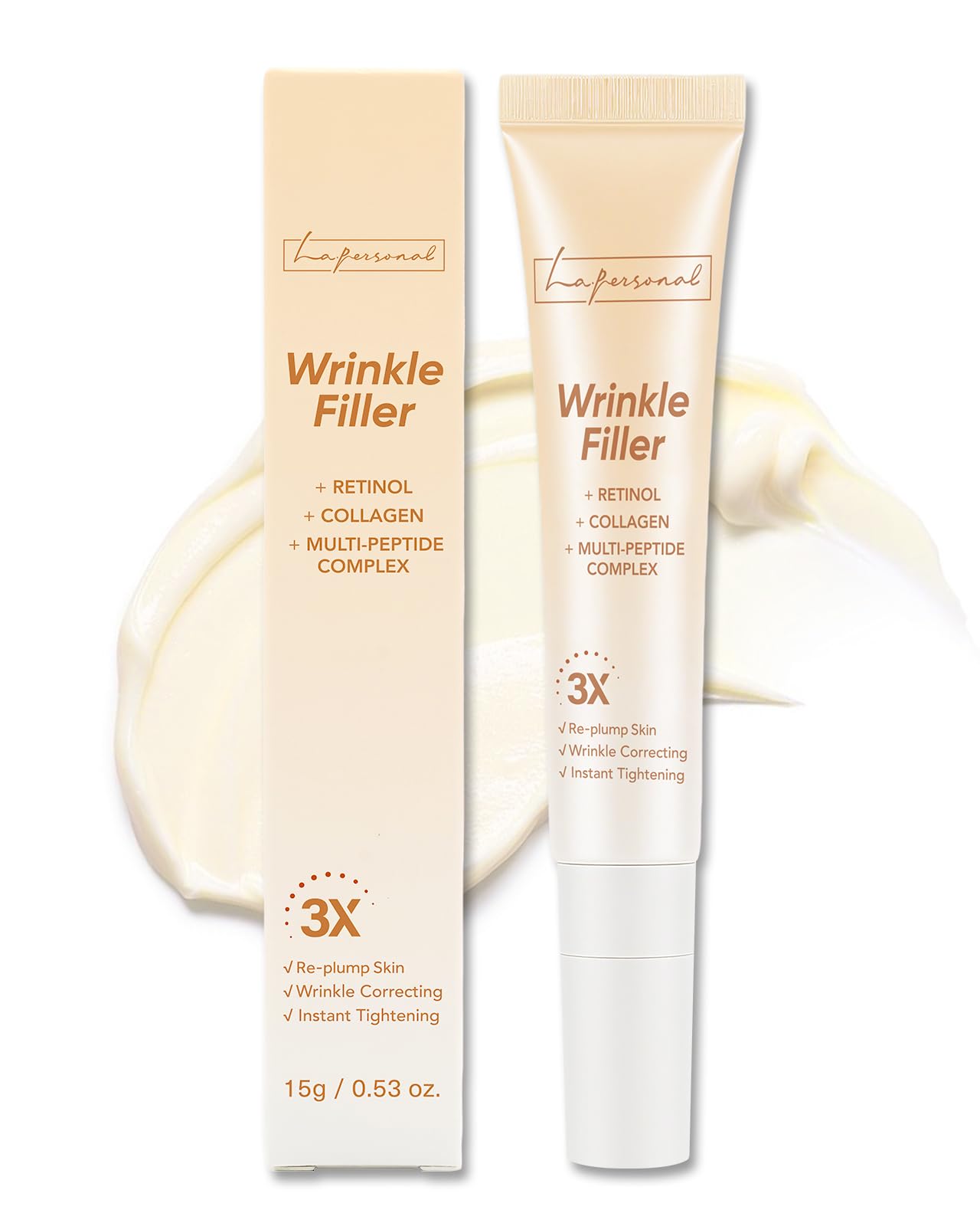 Specially designed to smooth fine lines and wrinkles, this anti-wrinkle compression cream offers multiple benefits in one. It penetrates deeply into the skin to reduce the appearance of fine lines and wrinkles. At the same time, its intensely hydrating essence moisturizes the skin, plumping it from within to firm and smooth dry, wrinkled areas. After application, skin appears refined and smooth, regaining its bounce, tone, and radiance. SAFETY WARNING NoGENTLE CARE FOR DELICATE SKIN: This eye cream is specially formulated to firm and lift the skin. Its natural and gentle ingredients make it suitable even for the delicate eye area. Its light texture absorbs easily. Ideal for reducing fine lines and dullness. REVITALIZING AND RADIANT: This eye and face cream offers a triple benefit: firming, hydration, and radiance. A powerful treatment that nourishes your skin in one step. For younger-looking, more refined skin. LONG-LASTING HYDRATION: This anti-wrinkle face cream is enriched with glucomannan and hyaluronic acid, which deeply hydrate, nourish, and soothe the skin. Skin becomes plumper and smoother, helping you say goodbye to a tired look. FOR SKIN AGING: The anti-wrinkle cream is rich in retinol and collagen, which help reduce the signs of skin aging. Apply morning and evening for 4 consecutive weeks to progressively improve puffiness and sagging skin. Improve skin firmness and reveal a youthful, revitalized complexion. VISIBLY REDUCES WRINKLES: Say goodbye to fine lines, crow's feet, forehead wrinkles, smile lines, and neck wrinkles! This wrinkle filler is enriched with a multi-peptide complex and Acmella oleracea extract, which quickly smooth the skin and improve its elasticity.Crème Rides, LA.PERSONAL Cème Yeux Anti Rides, Hydratant Lissant, Revitaliser Repulpe, Visage Soin Combleur De Rides Ciblé, Raffermit Peau pour Front, Yeux, Lèvres, Crème Hydratante, 15gDESCRIPTION DU PRODUIT DESCRIPTION DU PRODUIT Spécialement conçu pour lisser les ridules et les rides, ce compressif anti-rides offre plusieurs avantages en un. Il pénètre profondément dans la peau pour réduire les rides et ridules. Dans le même temps, son essence intensément hydratante hydrate la peau, la "repulpe " de l'intérieur pour raffermir et lisser les zones sèches et ridées. Après l'application, la peau semble affinée et lisse et retrouve son rebond, sa tonicité et son éclat. AVERTISSEMENT DE SÉCURITÉ NonSOIN DOUX POUR LES PEAUX DÉLICATES : cette crème pour les yeux est spécialement formulée pour raffermir et lifter la peau. Ses ingrédients naturels et doux la rendent adaptée même à la zone délicate du contour des yeux. Sa texture légère pénètre facilement. Idéale pour atténuer les ridules et le teint terne. RÉVITALISANTE ET ÉCLATANTE : cette crème de soin pour les yeux et le visage offre un triple bénéfice : raffermissement, hydratation et éclat. Un soin puissant qui nourrit votre peau en une seule étape. Une peau plus jeune et plus raffinée. HYDRATATION LONGUE DURÉE : cette crème anti-rides pour le visage est enrichie en glucomannane et en acide hyaluronique, qui hydratent, nourrissent et apaisent la peau en profondeur. La peau devient plus rebondie et plus lisse, et vous aide à dire adieu à votre air fatigué. POUR LE VIEILLISSEMENT CUTANÉ : La crème anti-rides est riche en rétinol et en collagène, qui aident à réduire les signes du vieillissement cutané. Appliquez matin et soir pendant 4 semaines consécutives pour améliorer progressivement le gonflement et le relâchement de la peau. Améliorez la fermeté de la peau et révélez un teint jeune et revitalisé. RÉDUIT VISIBLEMENT LES RIDES : Dites adieu aux ridules, aux pattes d'oie, aux rides du front, aux rides du sourire et aux rides du cou ! Le combleur de rides est enrichi d'un complexe multi-peptides et d'extrait d'acmella oleracea, qui lissent rapidement la peau et améliorent son élasticité.