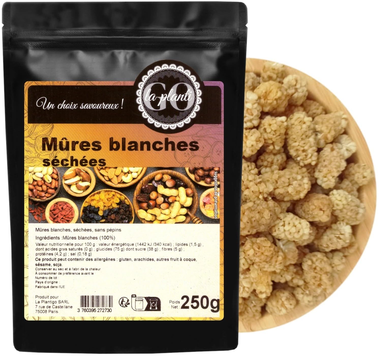 Ingredients: Ingredients: Dried mango, preservative (sulfur dioxide). Nutritional values per 100 g: Energy – 1442 kJ 340 kcal Fat – 1.5 g Of which saturates - 0.0 g Carbohydrate – 75 g Of which sugars - 65 g Fiber – 5 g Protein – 4.2 g Salt – 0.18 g Nutritional values were calculated from raw material databases and specifications. Individual batches may vary slightly. Allergen information: This product may contain the following allergens: gluten, peanuts, tree nuts, sesame, soy. Packaging method: The product is packaged in thick doypack-type pouches. The packaging features a welded cord closure, allowing for easy opening and resealing multiple times. Thanks to this simple technology, the product retains its freshness. Its organoleptic properties remain unchanged throughout its shelf life. Thanks to high sales volumes and our stock turnover, LA PLANTIGO products are always fresh, encouraging bulk purchases and pantry storage at home. INGREDIENTS White Blackberries 100