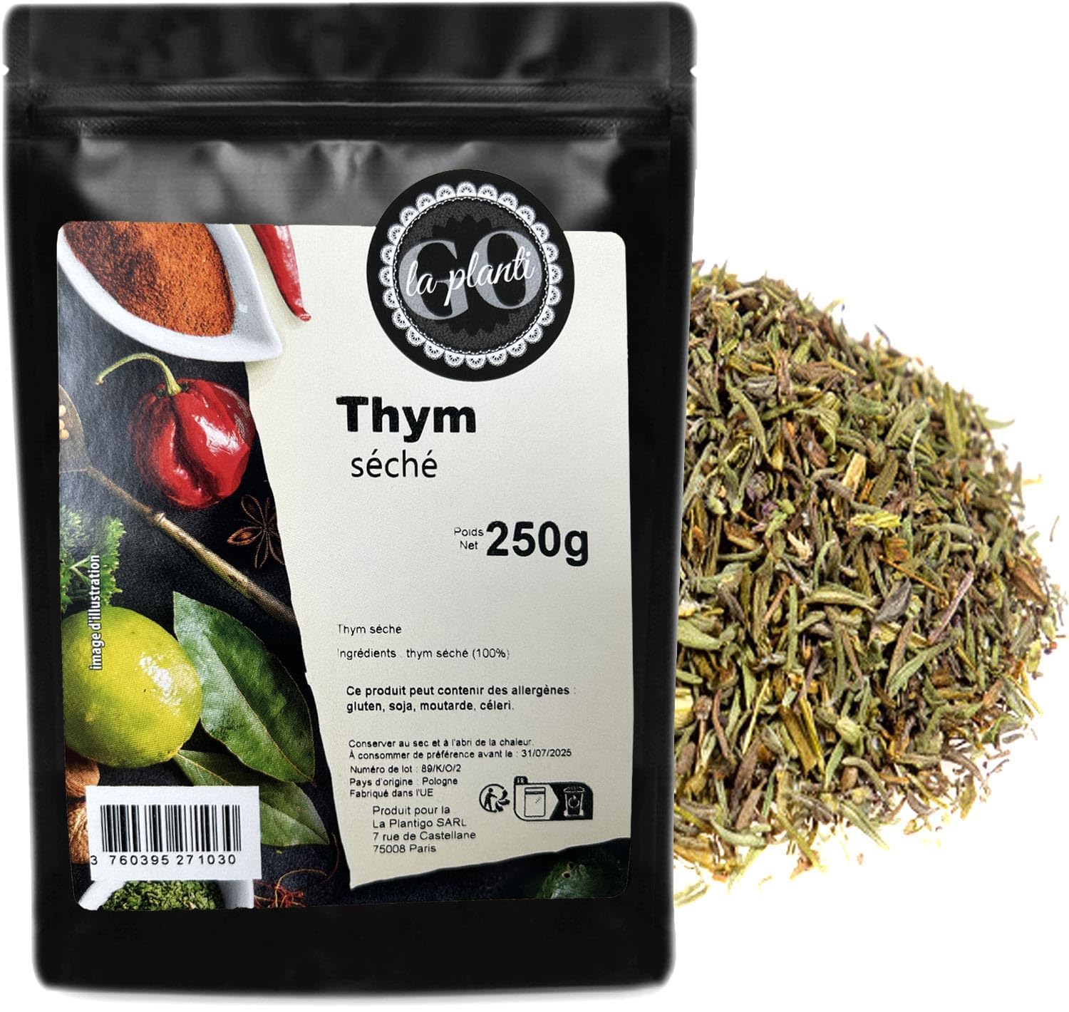 Ingredients: Dried thyme leaves (100 ) Allergen Information: This product may contain the following allergens: gluten, soy, mustard, celery. Packaging Method: The product is packaged in thick, doypack-style pouches. The packaging has a heat-sealed drawstring closure, allowing for easy opening and resealing multiple times. Thanks to this simple technology, the product retains its freshness. Its organoleptic properties remain unchanged throughout its shelf life. Thanks to high sales volumes and our stock turnover, LA PLANTIGO products are always fresh, making them ideal for bulk purchases and stocking up on food in your home pantry.
