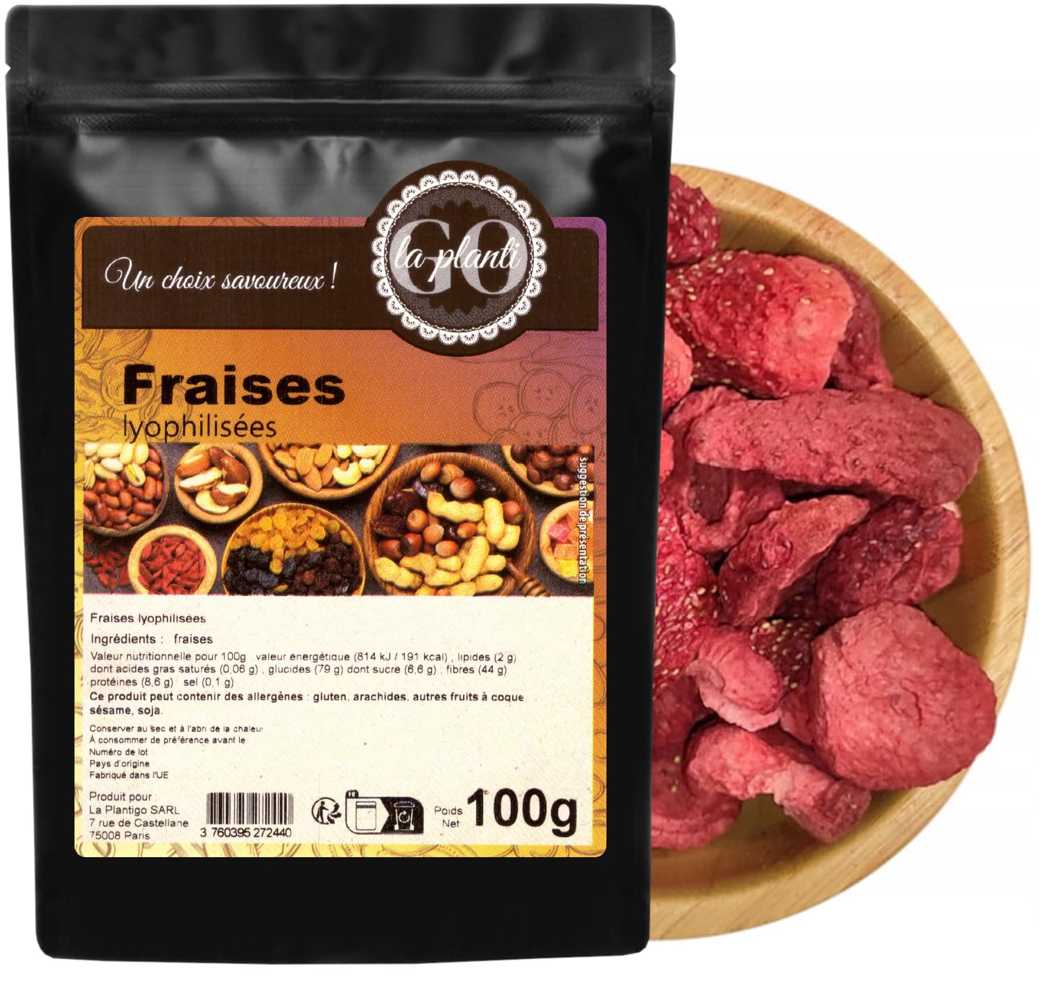 DESCRIPTION DU PRODUIT DESCRIPTION DU PRODUIT Ingrédients : Fraises lyophilisées (100 ) Valeurs nutritionnelles pour 100 g de fraises lyophilisées: Valeur énergétique – 1229 kJ 289 kcal Lipides – 4,1 g Dont acides gras saturés - 0,2 g Glucides – 74 g Dont sucres - 14,5 g Fibres – 19 g Protéines – 7,2 g Sel – 0,1 g Les valeurs nutritionnelles ont été calculées à partir de base de données et spécifications de matières premières. Les lots individuels peuvent varier légèrement. Information sur allergènes : Ce produit peut contenir les allergènes : gluten, arachides, fruit à coque, sésame, soja. Méthode d'emballage : Le produit est emballé dans des sachets épais de type « doypack ». L'emballage a une fermeture à cordon soudé, ce qui permet l'ouverture et la fermeture facile plusieurs fois. Grâce à cette technologie simple le produit garde sa fraicheur. Ses propriétés organoleptiques ne changent pas pendant toute la durée de conservation. Grâce aux volumes de ventes important et la rotation de nos stocks, les produits GOmigo sont toujours frais, ce qui favorise les achats en gros et le stockage des aliments dans le garde-manger à la maison. INGRÉDIENTS Fraises lyophilisées (100 )