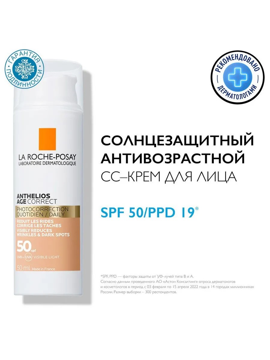 Чрезмерное пребывание на солнце способствует возникновению не только солнечных ожогов и аллергических реакций, но и быстрому старению кожи. Чтобы предотвратить и избежать таких последствий, необходимо использовать эффективные солнцезащитные средства. Антивозрастной СС крем для лица от La Roche-Posay предотвращает и корректирует имеющиеся признаки преждевременного старения кожи, вызванные ежедневным воздействием солнечных лучей. Подходит для всех типов кожи, в том числе для чувствительной и с розацеа. Обеспечивает 24 часа увлажнения. Средство имеет стойкое тонирующее покрытие и высокую степень защиты SPF 50 / PPD 19. При выборе продукта необходимо ориентироваться на потребности кожи - можно пользоваться с 18 лет. Протестировано под контролем дерматологов и офтальмологов. Можно использовать для кожи вокруг глаз. Результат применения: -22% морщины заметно сократились -29% пигментные пятна уменьшились +15% кожа стала более эластичной