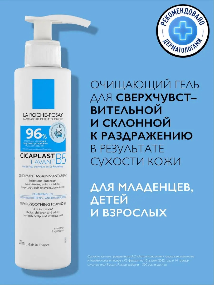 Cicaplast Lavant B5 Cleansing Gel for Face and Body is designed to gently cleanse the sensitive and dry skin of babies, children, and adults. Active Ingredients: Thermal water strengthens the skin's own defenses, providing an intense softening and moisturizing effect. The [Copper + Zinc + Manganese] complex has antibacterial properties. Panthenol 5% reduces signs of irritation and provides a soothing effect. Glycerin promotes deep skin hydration. Directions for use: Squeeze a sufficient amount of gel into the palm of your hand, rub until a light foam forms, and apply to the skin. Rinse with plenty of water without rubbing the skin. For optimal results, use in combination with Cicaplast Baume B5. Efficacy: Cicaplast Lavant B5 cleanses, moisturizes, and visibly soothes adult and baby skin. The pleasant foaming texture does not leave a dry feeling. After washing, the skin is clean and hydrated, looking healthier. Visible results*: skin is instantly soothed (96%), hydrated (90%), and feels 94% more comfortable. Free from soap, fragrances, and parabens. It has a physiological pH and is suitable for intimate hygiene. Optimal tolerance has been confirmed on sensitive skin under the supervision of dermatologists, pediatricians, gynecologists, and ophthalmologists. Can be used as a gift for a girlfriend, boyfriend, brother, girlfriend, friend, wife, husband, colleague, mother, child, or father for February 23rd, March 8th, New Year's (NY), or a birthday. *Consumer test, 49 respondents, 4 weeks.
