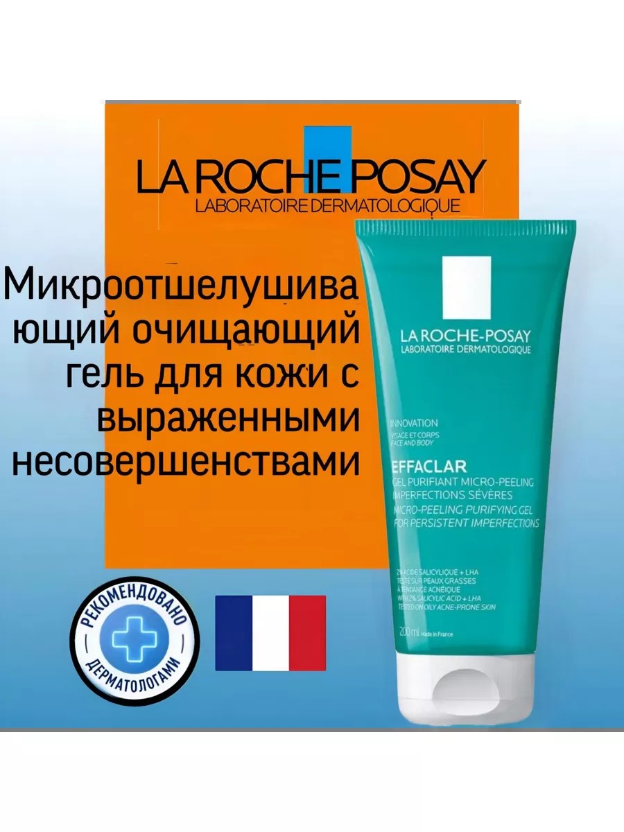 LA ROCHE-POSAY EFFACLAR Очищающий микроотшелушивающий гель, 200 мл. Для лица и тела. Протестировано на коже, склонной к акне. EFFACLAR Микроотшелушивающий гель интенсивно очищает кожу и поры от загрязнений, сокращает несовершенства, удаляет избыток кожного сала, оставляя кожу заметно более чистой и свежей. Формула с салициловой и липо-гидрокси-кислотой (LHA) обеспечивает микроотшелушивающий эффект без трения. Помогает сократить число выраженных несовершенств (-51%) и постакне (-57%). Клинически доказанная эффективность против повторного появления несовершенств. Подходит для лица и тела. Физиологический pH - Не содержит спирта.Способ применения продукта : Нанесите на влажную кожу нежными массирующими движениями, тщательно смойте. В случае попадания в глаза немедленно промыть водой. Дополните ваш ритуал ухода увлажняющим средством, подходящим вашему типу кожи.