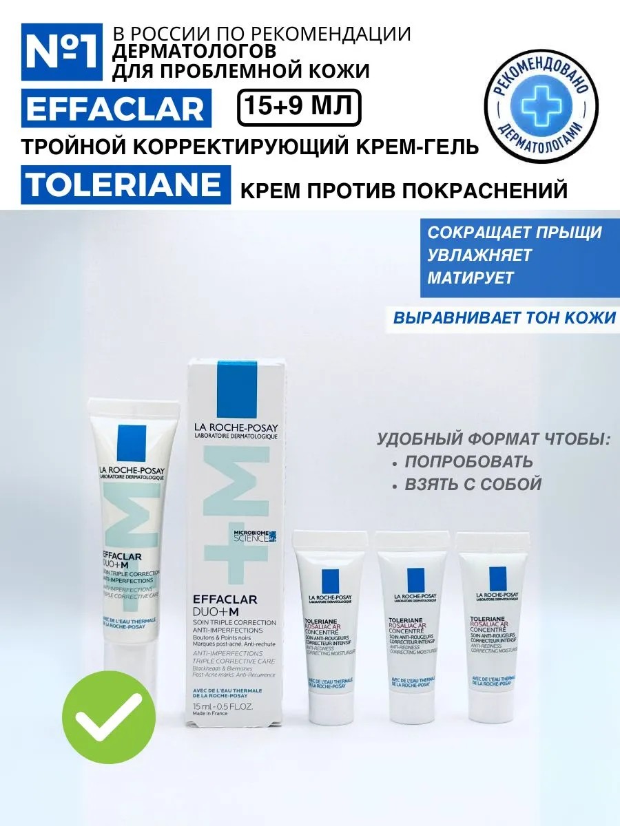 В набор входит: Тройной корректирующий крем-гель для проблемной кожи Effaclar Duo+M 15 мл и Крем Toleriane Rosaliac AR 9 мл