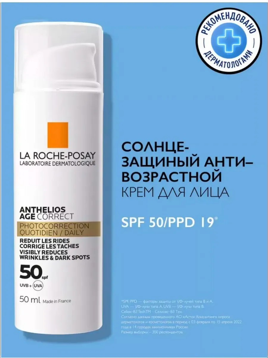 Солнцезащитный антивозрастной крем для лица Anthelios SPF 50 / PPD 19 предотвращает и корректирует признаки преждевременного старения кожи, вызванные ежедневным воздействием ультрафиолета. Активные ингредиенты: технология Cellox-B3 Techна основе фотозащитных фильтров Mexoryl XL и антиоксидантов обеспечивает надежную защиту от солнечных UVA/UVB-лучей. Низкомолекулярная гиалуроновая кислота интенсивно увлажняет, способствует сокращению, разглаживанию морщин. Витамин B3 (ниацинамид, никотиновая кислота) оказывает успокаивающее действие. Термальная вода и витамин E (токоферол) обладают антиоксидантными и защитными свойствами. Способ применения: каждое утро после очищения, тонизации и основного ухода на лицо, включая зону вокруг глаз,а также шею и зону декольте. Если необходим макияж, наносите его поверх солнцезащитного средства. Эффективность: эффективность доказана клинически, после 8 недель применения: морщины сокращаются на 22%, пигментные пятна уменьшаются на 29%, эластичность кожи повышается на 15%. Солнцезащитный антивозрастной крем Anthelios SPF 50 обеспечивает высокую степень защиты от UV-лучей. Предотвращает и корректирует возрастные изменения, вызванные воздействием солнца Поддерживает 24 часа увлажнения, выравнивает цвет лица, обеспечивает корректирующее и омолаживающее действие. Легкая, нелипкая текстура быстро впитывается, не оставляя жирных следов. Может использоваться в качестве базы под макияж. Подходит для всех типов кожи, включая чувствительную. Гипоаллергенно. Некомедогенно. Протестировано под контролем дерматологов и офтальмологов. Cолнцезащитное средство для поддержания красоты, молодости и здоровья увядающей женской и мужской кожи; уход для сияния, выравнивания и омоложения кожи; водостойкий солнцезащитный крем; косметика с выравнивающим и разглаживающим действием; несмываемый солнцезащитный дневной уход для гладкой, сияющей и здоровой кожи. Anthelios – Ля Рош-Позе Антгелиос Солнцезащитный антивозрастной крем для лица SPF 50/PPD 19, 50 мл.