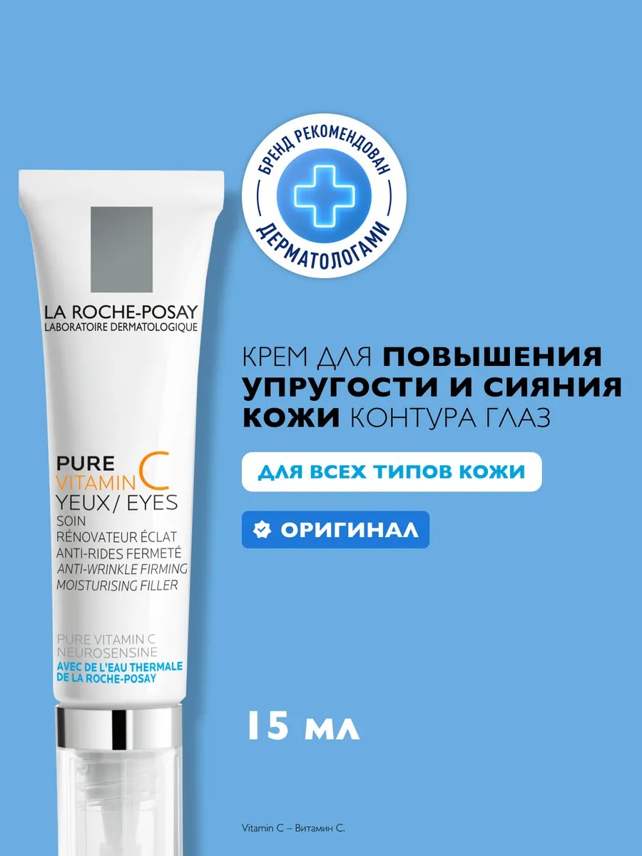 Крем-филлер La Roche-Posay Pure Vitamin C Yeux разглаживает морщины, предупреждает возрастные изменения контура глаз, возвращает коже упругость и заметное сияние. АКТИВНЫЕ ИНГРЕДИЕНТЫ: Чистый витамин С - мощный антиоксидант, стимулирует выработку коллагена, улучшает цвета лица. Содержится в формуле в концентрации 5%. Гиалуроновая кислота и манноза поддерживают оптимальный уровень увлажнения, делают кожу более гладкой и предотвращают раннее старение. Мадекассосид восстанавливает межклеточный матрикс, повышает упругость кожи и способствует разглаживанию морщин в области вокруг глаз. Нейросенсин и термальная вода La Roche-Posay обеспечивают увлажняющий и успокаивающий эффект, придают коже лица чувство комфорта и мягкости. Глицерин предотвращает трансэпидермальную потерю влаги и укрепляет защитный барьер. Масло карите (ши) обеспечивает интенсивное питание и увлажнение кожи, оказывает заметное разглаживающее и антивозрастное действие. СПОСОБ ПРИМЕНЕНИЯ: Наносить утром и вечером на кожу вокруг глаз, распределяя от внутреннего уголка глаза к внешнему. Избегать нанесения на подвижное веко. Чистый Витамин C может реагировать на взаимодействие с воздухом и темнеть. Это не влияет на эффективность и переносимость средства. ЭФФЕКТИВНОСТЬ: Крем-филлер Pure Vitamin C Yeux эффективно корректирует морщины, значительно повышает упругость, оказывает выравнивающее действие и дарит коже сияние. Снижает чувствительность, успокаивает и смягчает кожу в зоне вокруг глаз. Крем обладает освежающей текстурой, не оставляет жирного блеска. Подходит для чувствительной кожи и для тех, кто носит контактные линзы. Без парабенов. Может использоваться в качестве подарка девушке, парню, брату, подруге, другу, жене, мужу, коллеге, маме, папе на 23 февраля, 8 марта, Новый год (НГ) или день рождения. *Вы также можете найти данное средство по запросам: французская аптечная дермокосметика для дневного и ночного anti-age (анти-эйдж) ухода за зрелой кожей женщин и мужчин