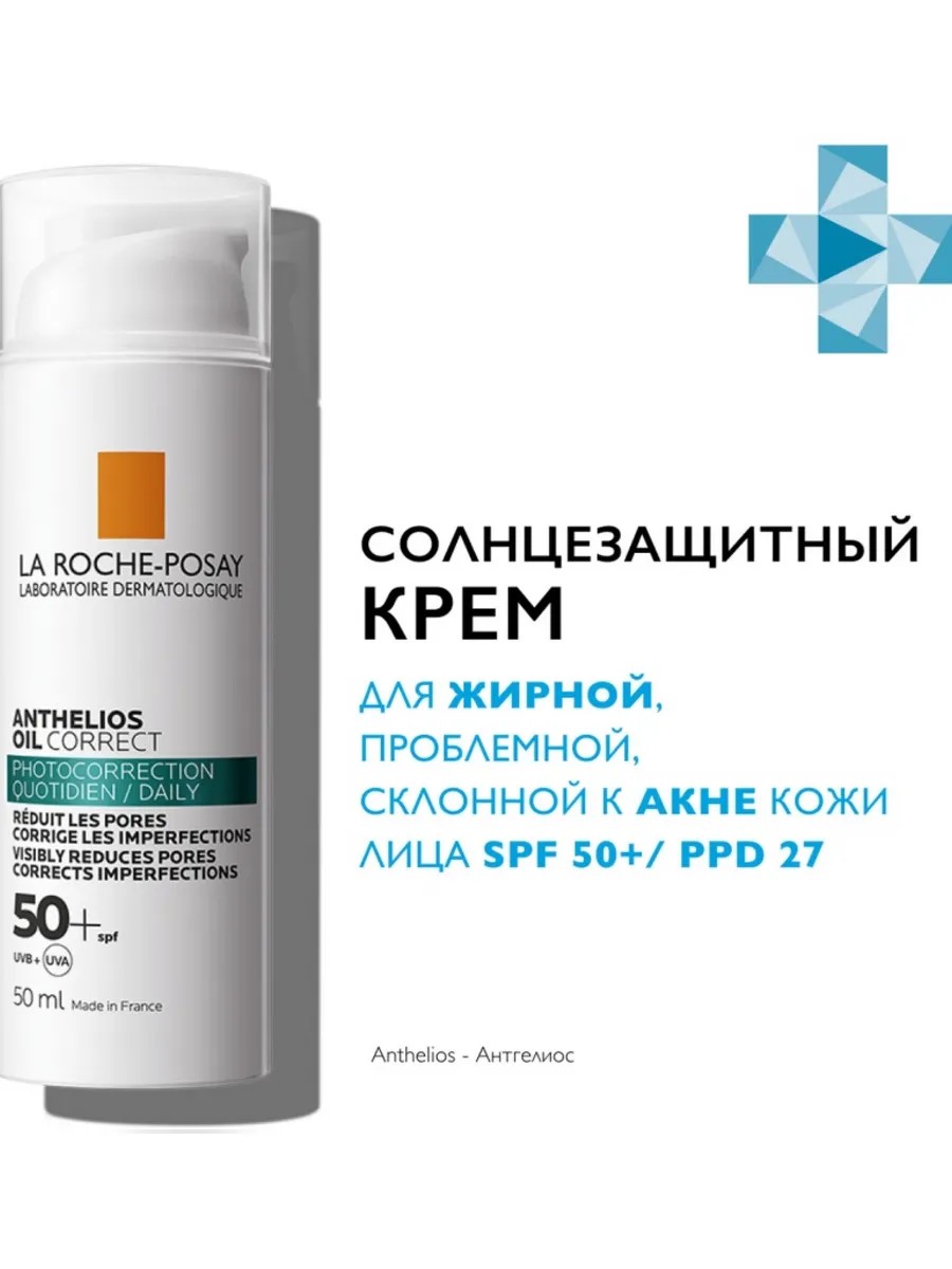 Солнцезащитное средство для лица La Roche-Posay Anthelios Oil Correct SPF 50+/PPD 27 защищает кожу от солнечных UV-лучей и обладает корректирующим действием.