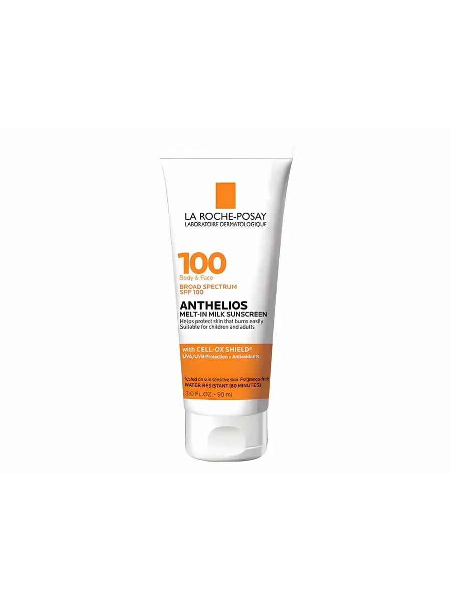 La Roche-Posay Anthelios Melt-in Milk SPF 100 sunscreen provides maximum protection against UVA and UVB rays with SPF 100, making it ideal for sensitive skin prone to sunburn. The formula with exclusive Cell-Ox Shield technology combines UVA/UVB filters and antioxidants, providing reliable protection and care. The cream's light texture is quickly absorbed without leaving a white residue and is suitable for use on the face and body, including the ears, nose, neck, and hair. This product is water-resistant (80 minutes), does not contain oxybenzone or octinocate, is hypoallergenic, fragrance-free, and paraben-free.