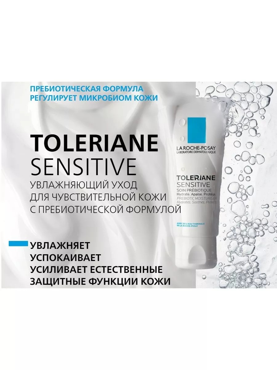 NEW EXPERTISE: The skin microbiome is a collection of billions of bacteria living on the skin's surface. Bacteria help regulate the skin's internal processes to maintain a balanced microflora. For sensitive skin, it's important not only to strengthen its protective barrier but also to normalize the composition of the skin's microbiome. Prebiotics—components that provide a comfortable environment for friendly microorganisms—can help regulate the microbiome. Toleriane Sensitive prebiotic care not only moisturizes the skin and prevents moisture loss but also helps reduce the signs of hypersensitivity: it soothes, eliminates tightness, and restores comfort. FREE OF FRAGRANCES, ALCOHOL, DYES, PARABENS, MINERAL OILS, OR LANOLIN. High safety standards typical of La Roche-Posay: Toleriane Sensitive lightweight cream is safe even for infants. Directions for use: Apply twice daily to cleansed skin. Light, non-greasy texture is quickly absorbed. Product ingredients: Aqua/Water, Glycerin, Dimethicone, Hydrogenated Polyisobutene, Zea Mays Starch/Corn Starch, Niacinamide, Ammonium Polyacryloyldimethyl Taurate, Myristyl Myristate, Stearic Acids, Ceramide Np, Potassium Cetyl Phosphate, Glyceryl Stearate Se, Sodium Hydroxide, Myristic Acids, Palmitic Acids, Capryloyl Glycine, Caprylyl Glycol, Xanthan Gum, Tocopherol. (CODE FIL: B203092/2)