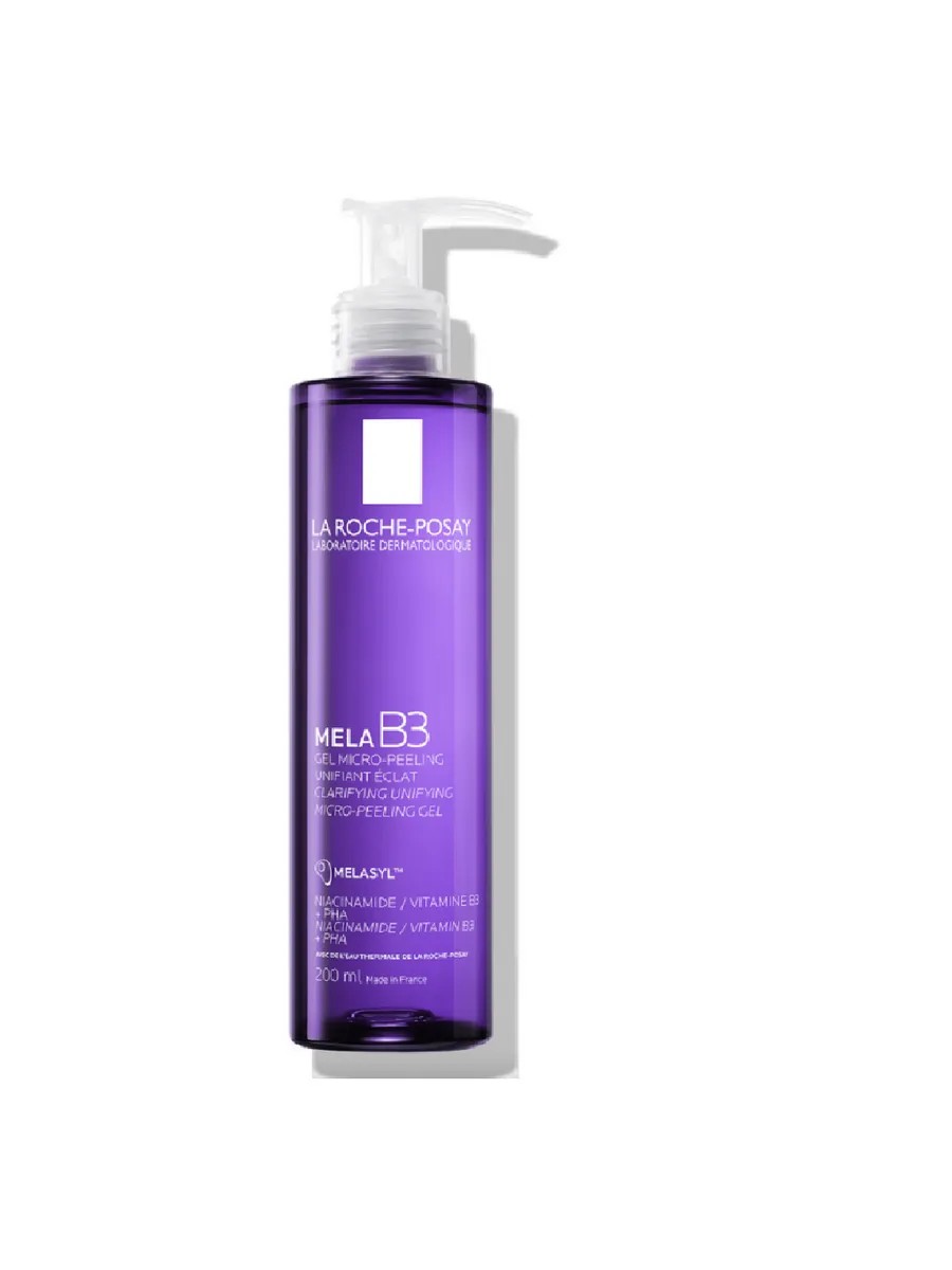 La Roche-Posay. Mela B3 Anti-Pigmentation Cleansing Peeling Gel for Face and Body, 200ml. Micro-peeling gel for correcting hyperpigmentation of sensitive skin of the face and body. To prevent and correct pigmentation, PHA acid gently exfoliates the top layer and accelerates skin cell renewal. The peeling gel gently cleanses the skin and visibly evens out skin tone and texture. Skin tone appears more even after 5 weeks, and age spots are visibly reduced. All types of pigmentation: age spots associated with UV exposure or age-related changes, post-acne spots, dullness, and uneven skin tone.
