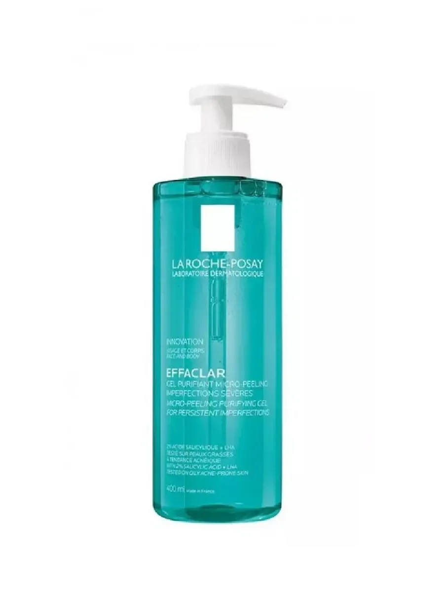 Effaclar Микроотшелушивающий очищающий гель для лица и тела от прыщей, черных точек и постакне с салициловой кислотой, для умывания жирной, проблемной кожи, 400 мл. Интенсивно очищает кожу, скрывает несовершенства, обеспечивает себорегулирующее действие. Способствует уменьшению акне, угрей, прыщей, сыпи и других несовершенств, удаляет избыток себума, оставляя кожу чистой и свежей. Салициловая кислота (BHA) 2% обеспечивает мягкое отшелушивание кожи и глубокую очистку пор. Липогидроксикислота (LHA) выравнивает рельеф кожи, уменьшает интенсивность пятен, рубцов, следов постакне, помогает очистить черные точки. Глицерин растительного происхождения увлажняет и смягчает кожу. Цинк обеспечивает матирующий эффект, помогает убрать признаки жирности кожи. Термальная вода укрепляет защитный барьер. Ментол оказывает мгновенный освежающий эффект. Гель Effaclar предназначен для ежедневного умывания и очищения жирной, проблемной кожи со склонностью к несовершенствам. Подходит для ухода за взрослой и молодой женской, мужской и подростковой кожей (с 14 лет). Способ применения: нанесите на влажную кожу, помассируйте и тщательно смойте, затем нанесите увлажняющий крем или уходовое косметическое средство, подходящее вашему типу кожи. Может использоваться как гель для душа и ванны. Очищающий гель Effaclar упакован в бутылку с дозатором объемом 400 мл. Гипоаллергенная формула с ментоловым компонентом на водной основе не содержит спирта, протестирована на коже, склонной к акне.