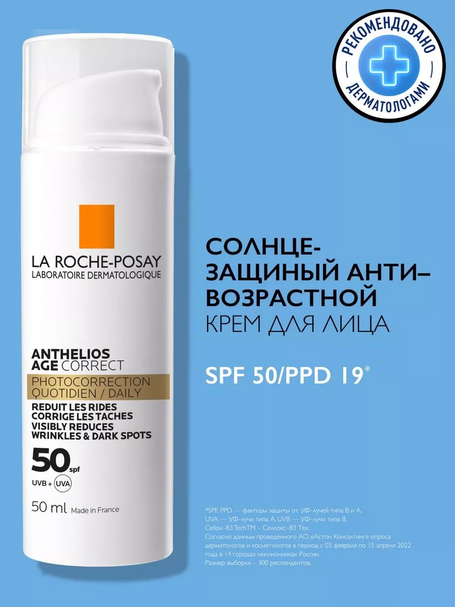 Солнцезащитный антивозрастной крем для лица Anthelios SPF 50 / PPD 19 предотвращает и корректирует признаки преждевременного старения кожи, вызванные ежедневным воздействием ультрафиолета. АКТИВНЫЕ ИНГРЕДИЕНТЫ: технология Cellox-B3 Techна основе фотозащитных фильтров Mexoryl XL и антиоксидантов обеспечивает надежную защиту от солнечных UVA/UVB-лучей. Низкомолекулярная гиалуроновая кислота интенсивно увлажняет, способствует сокращению, разглаживанию морщин. Витамин B3 (ниацинамид, никотиновая кислота) оказывает успокаивающее действие. Термальная вода и витамин E (токоферол) обладают антиоксидантными и защитными свойствами. СПОСОБ ПРИМЕНЕНИЯ: наносите каждое утро после очищения, тонизации и основного ухода на лицо, включая зону вокруг глаз, а также шею и зону декольте. Если необходим макияж, наносите его поверх солнцезащитного средства. ЭФФЕКТИВНОСТЬ: эффективность доказана клинически, после 8 недель применения: морщины сокращаются на 22%, пигментные пятна уменьшаются на 29%, эластичность кожи повышается на 15%. Солнцезащитный антивозрастной крем Anthelios SPF 50 обеспечивает высокую степень защиты от UV-лучей. Предотвращает и корректирует возрастные изменения, вызванные воздействием солнца. Поддерживает 24 часа увлажнения, выравнивает цвет лица, обеспечивает корректирующее и омолаживающее действие. Легкая, нелипкая текстура быстро впитывается, не оставляя жирных следов. Может использоваться в качестве базы под макияж. Подходит для всех типов кожи, включая чувствительную. Гипоаллергенно. Некомедогенно. Протестировано под контролем дерматологов и офтальмологов. Anthelios – Ля Рош-Позе Антгелиос Солнцезащитный антивозрастной крем для лица SPF 50/PPD 19, 50 мл.