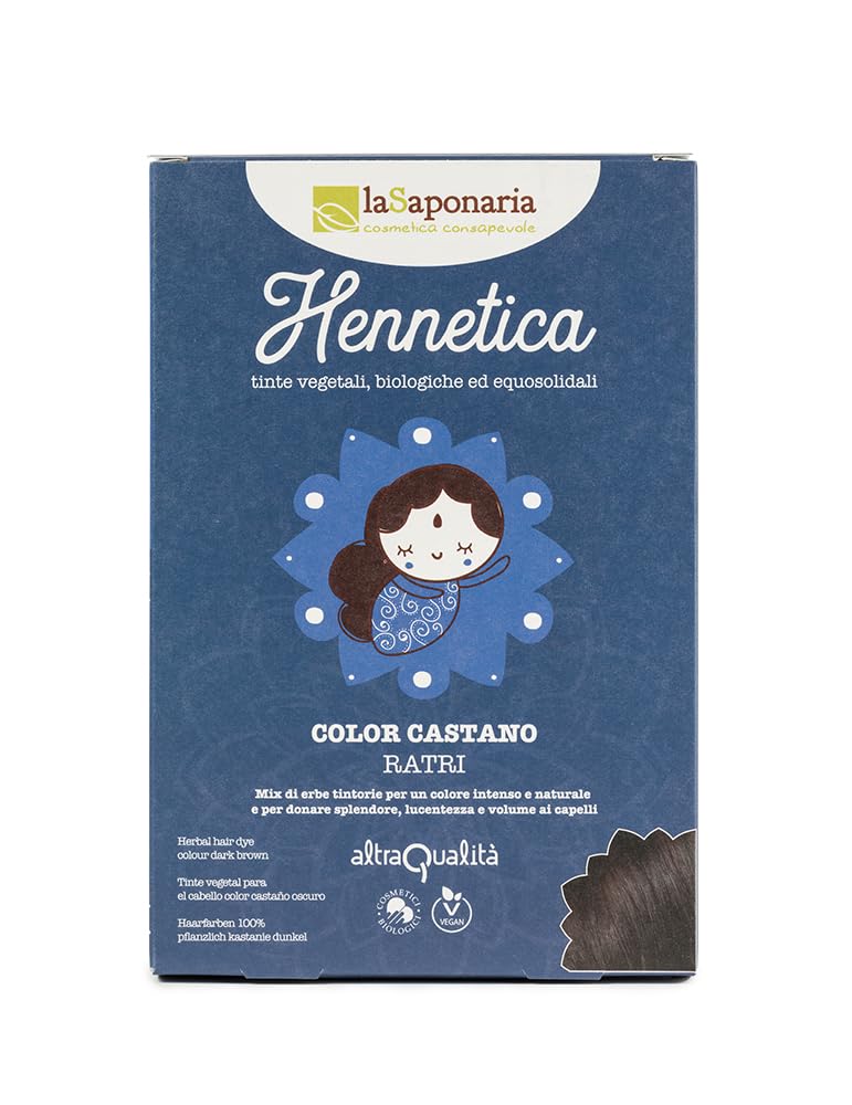 Easy to prepare and apply. Simply mix the powder with warm water, apply, leave on, and rinse with water only: the color intensifies over the next 24 to 48 hours. Easy to apply: follow the instructions, rinse with water only, wait 24–48 hours, then shampoo: the color sets and reveals its full intensity. Ideal for those seeking conscious beauty: an eco-friendly and natural choice, perfect for cleaner karma. Healthy and luminous hair: nourishes the hair, improves hair structure, and adds body and shine. Intense copper highlights: gives warm hair brilliant copper tones for a seductive and vibrant look. Natural and organic hair color: only dye herbs and pure henna, without ammonia, picram, metallic salts, or chemical additives.Facile à préparer et à appliquer. Il suffit de mélanger la poudre avec de l'eau chaude, d'appliquer, de laisser poser et de rincer uniquement à l'eau : la couleur s'intensifie dans les 24 à 48 heures suivantes. Facile à appliquer : suivez les instructions, rincez uniquement à l'eau, attendez 24 – 48 h puis shampoing : la couleur se fixe et révèle toute son intensité. Idéal pour ceux qui recherchent une beauté consciente : un choix écologique et naturel, parfait pour un karma plus propre. Cheveux sains et lumineux : nourrit la chevelure, améliore la structure du cheveu et ajoute corps et brillance. Réflexes cuivrés intenses : donne aux cheveux chauds des tons cuivre brillants, pour un look séduisant et vibrant. Coloration naturelle et biologique : uniquement des herbes de teinture et du henné pur, sans ammoniaque, picramé, sels métalliques ou additifs chimiques.La Saponaria Coloration cheveux végétale châtain foncé Ratri 100 g