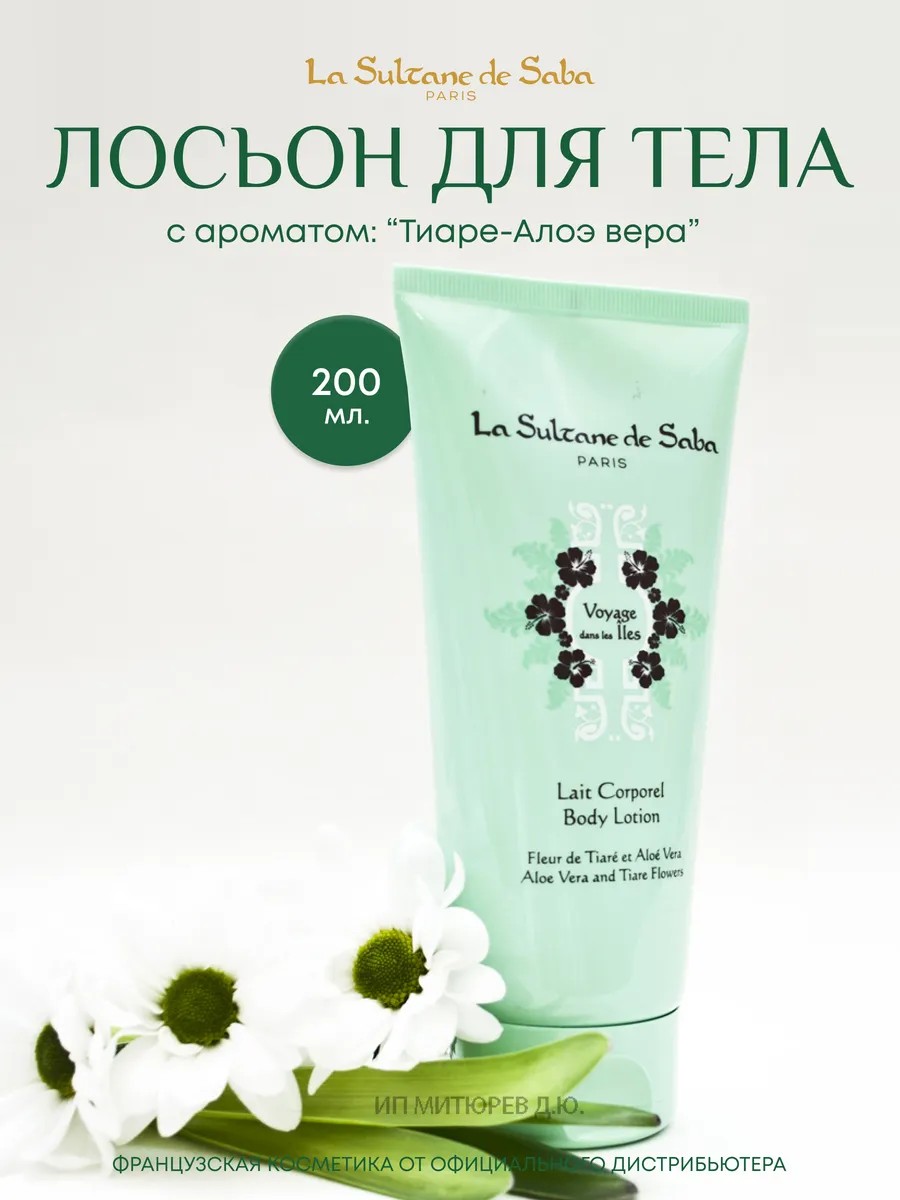 La Sultane De Saba Tiare Aloe Vera Body Lotion - La Sultane de Saba body milk contains everything you need to maintain your skin in perfect condition. Ideal for daily use, this product contains Shea Butter, Sweet Almond Oil, Shea Butter, Coconut Oil, Honeysuckle Extract, and Japanese Honeysuckle Extract. It has a light yet rich texture and is quickly absorbed without leaving a residue. This body lotion has strengthening properties, provides total hydration that lasts 24 hours, imparting a feeling of comfort and enveloping with exquisite aromas. Skin acquires a healthy appearance, becomes silky and more elastic. This moisturizing lotion is available in the following scents: Amber, Orange Blossom, Ayurveda, Green Tea, Ginger, Vanilla, Shea from the Islands, Turkish Delight, and Rose. French cosmetics La Sultane de Saba are the best organic skincare products. All-natural ingredients, suitable for vegans. This lotion is ideal for skin, body, hand, and foot care. La Sultan de Saba cosmetics are suitable for both women and men. It can be used by pregnant women to prevent stretch marks; it moisturizes and nourishes the skin, leaving a unique scent that lasts all day. This body milk is suitable for children from birth. This body and face lotion nourishes, moisturizes, and restores the skin after depilation, relieving irritation. It is especially effective for dry skin. The enveloping and seductive aroma of the perfumed lotion lingers on the body for a long time and can replace perfume. How to use: Apply morning or evening to clean skin with light massaging movements. Recommended for daily use. The best gift for a girlfriend, friend, mother, wife, loved one, sister, colleague, grandmother, woman, man, dad, brother, friend, or husband. An excellent gift for New Year, birthday, anniversary, March 8th, February 14th, holiday, graduation, or wedding.