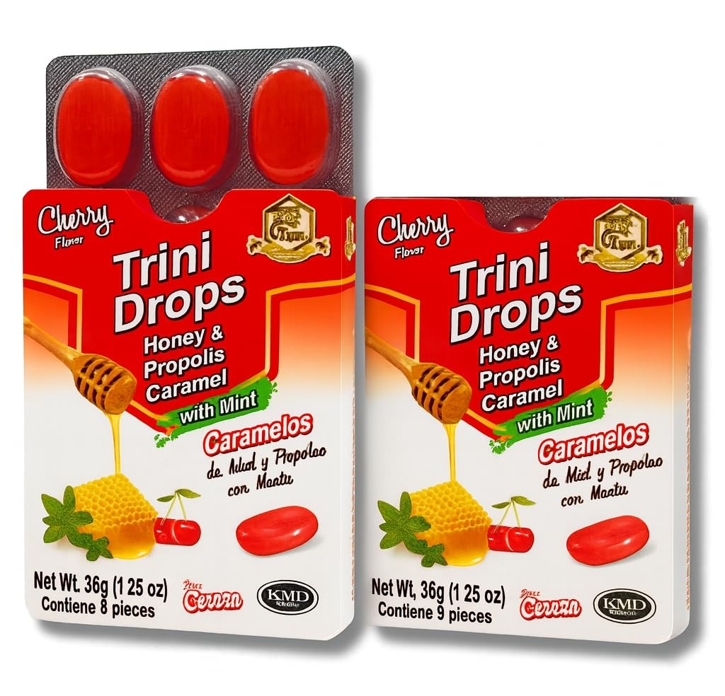 La Tía Trini – Propolis, Mint Cherry Candies – 2 Pack (9 Pieces Each) – Natural Honey Propolis Lozenges – Refreshing Soothing Candy – Traditional Mexican Treat Dulce Tradicional Mexicano. La Tía Trini Propolis, Mint Cherry Candies bring together natural honey and propolis with the fruity sweetness of cherry and the refreshing taste of mint. Individually wrapped for freshness, each 2-pack includes 9 candies per bag (18 total). Free from artificial preservatives, flavors, or colors, these traditional Mexican lozenges are a wholesome, soothing treat you can enjoy anytime your throat feels dry or you just want a refreshing candy. ESPAÑOL: Los Caramelos de Propóleo, Menta y Cereza de La Tía Trini combinan miel y propóleo naturales con la dulzura frutal de la cereza y el sabor refrescante de la menta. Envuelto individualmente para mayor frescura, cada paquete doble incluye 9 caramelos por bolsa (18 en total). Libres de conservadores, sabores y colorantes artificiales, estos dulces tradicionales mexicanos son un caramelo reconfortante y saludable que puedes disfrutar en cualquier momento, especialmente cuando la garganta se siente seca o buscas frescura natural. ? Legal Disclaimer Not a medicine or dietary supplement. This product is not intended to diagnose, treat, cure, or prevent any disease. For enjoyment as candy lozenge only.La Tia Trini, Traditional Mexican Candy Dulce Tradicional Mexicano A heritage recipe passed down for generations, offering authentic taste and culture. Una receta tradicional transmitida por generaciones, con sabor y cultura auténticos. Soothing Candy Tradition Dulce Reconfortante Tradicional Enjoyed as a natural lozenge when you want refreshing comfort. Disfrutado como caramelo natural cuando se busca frescura y confort. No Artificial Additives Sin Aditivos Artificiales, Tos. Free from artificial colors, flavors, and preservatives. Libres de colorantes, sabores y conservadores artificiales. La Tia Trini, Practical 2-Pack Paquete Práctico de 2 9 individually wrapped candies per pack (18 total). 9 caramelos envueltos individualmente por paquete (18 en total). Cherry Mint Flavor Sabor de Cereza y Menta Fruity sweetness balanced with refreshing cool mint. Dulzura frutal combinada con frescura de menta. La Tia Trini, Honey Propolis Tradition Tradición de Miel y Propóleo Made with natural bee ingredients for authentic sweetness comfort. Hechos con ingredientes de la abeja para una dulzura auténtica y reconfortante.