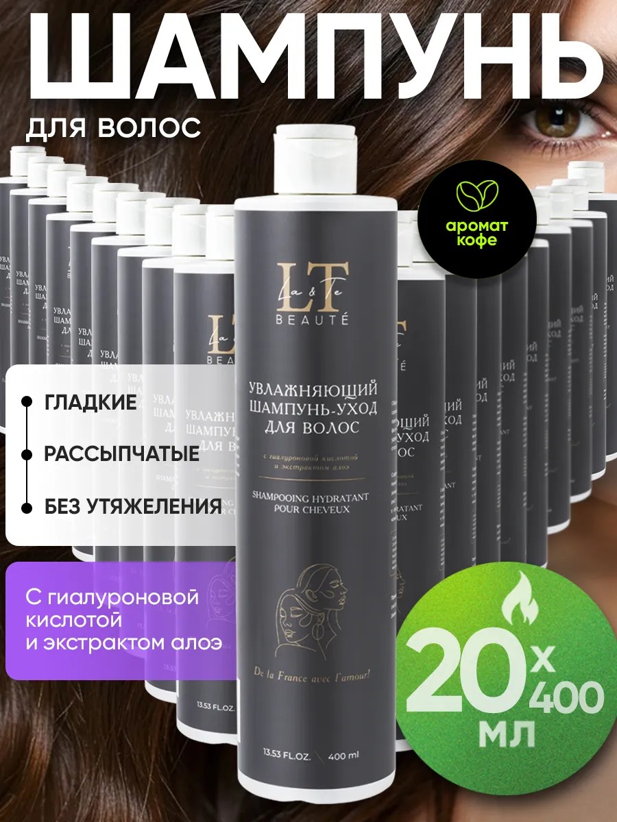 A hair shampoo with a pleasant coffee aroma for cleansing the scalp and hair from La & Te beauté. La & Te beauté offers high-quality hair care products suitable for the whole family. This moisturizing hair care shampoo with hyaluronic acid and aloe extract saturates hair with essential moisture, vitamins, and minerals. Upon contact with hair, this moisturizing shampoo forms a special, airy foam that deeply cleanses without drying out or causing a "squeaky" feeling. Sodium hyaluronate forms a protective layer on the hair surface, not only preventing moisture evaporation due to its physical properties but also helping to retain it thanks to its ability to bind water. Aloe extract contains polysaccharides, which help significantly slow hair loss and accelerate hair growth. The vitamins and minerals contained in aloe improve the overall condition of the scalp, reducing dandruff. Directions: Apply to damp hair, massage in, distribute evenly, then rinse with water. This shampoo makes a practical gift for a sister, friend, mother, or colleague for a birthday, New Year's, International Women's Day, or any other occasion. Please note that this product is available in bulk at a great price!