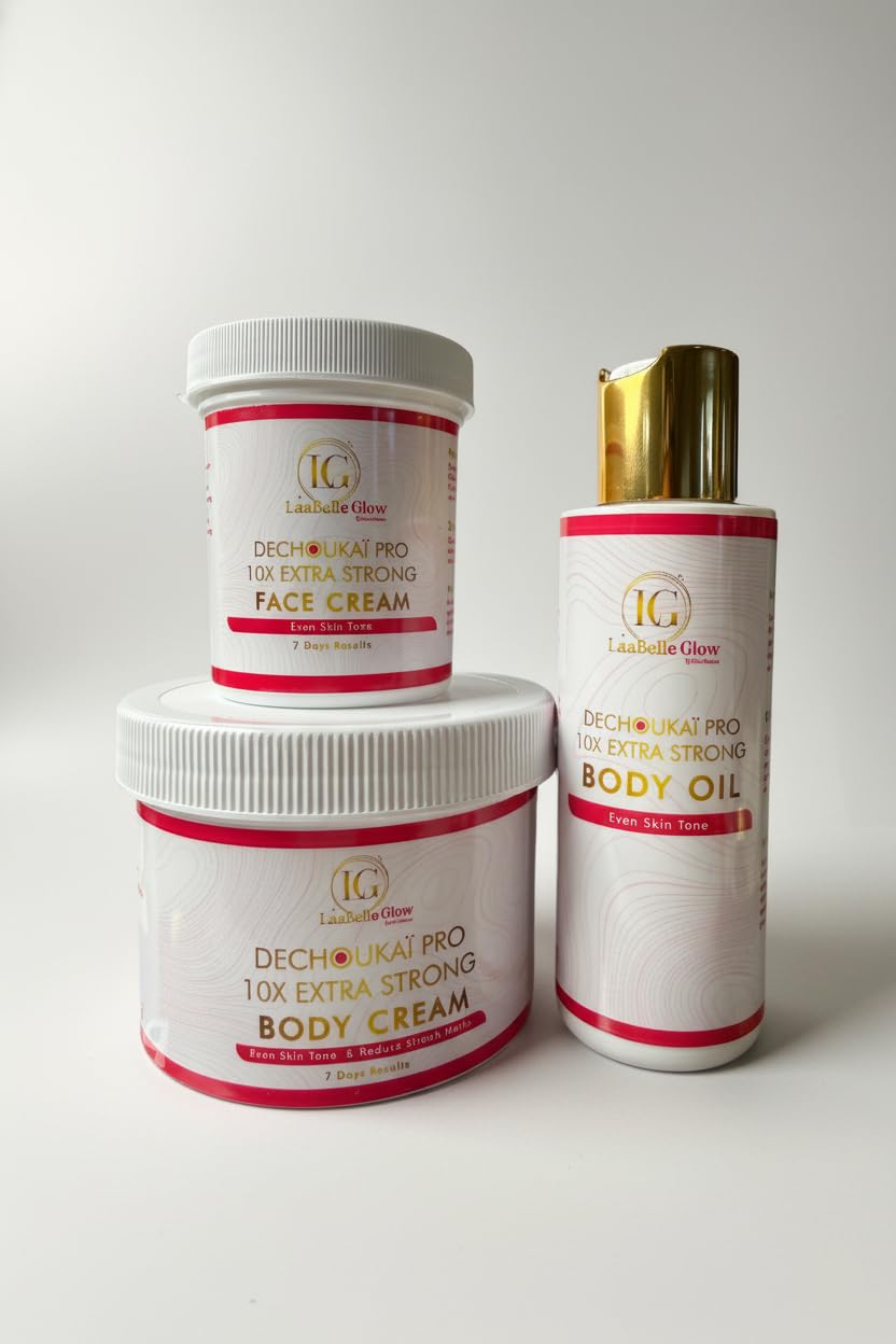 The Dechoukaï Pro 10X Extra Strong Kit by LaaBelle Glow is a comprehensive skincare solution designed to help you achieve an even, radiant complexion. This powerful collection includes a face cream, body cream, and body oil, all formulated to work together for visible results in just 7 days. The 10X extra strong formula targets uneven skin tone and helps reduce the appearance of dark spots and blemishes, promoting a luminous glow from head to toe. The face cream is specifically designed for delicate facial skin, while the body cream provides rich hydration for larger areas. The body oil, presented in an elegant gold-capped bottle, delivers concentrated nourishment and helps lock in moisture for silky-smooth skin. This coordinated system allows you to maintain a consistent skincare routine across your entire body. Perfect for those seeking intensive skin tone correction and a radiant complexion, this kit provides everything you need for a complete transformation.