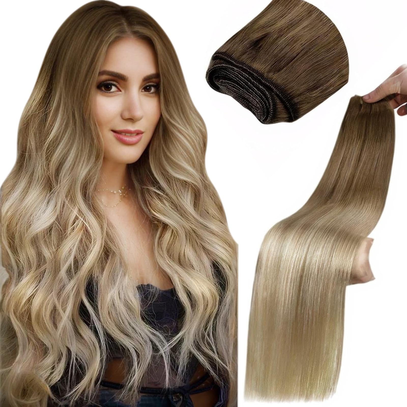 LaaVoo Extensions Tressen Echthaar Ombre Braun Haartressen Echthaar Zum Einnähen Balayage Braun Blond Remy Sew in Weft Hair Extensions Echthaar Glatt 100g 50cm #8/18/60 50cm 1.23#8/18/60