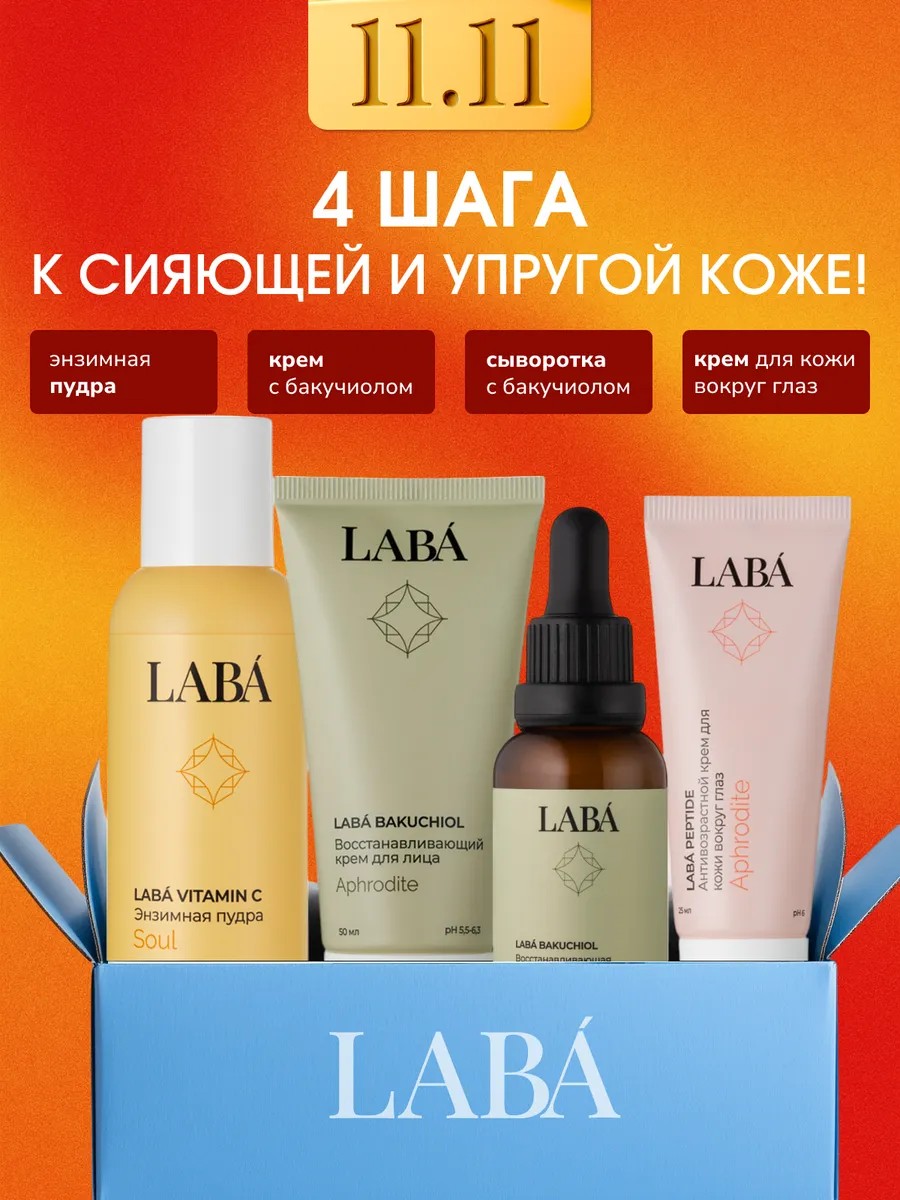 | Комплектация | Энзимная пудра LABÁ Vitamin C, 60 г; Антивозрастной крем для кожи вокруг глаз LABÁ Peptide, 25 мл; Восстанавливающий крем для лица LABÁ Bakuchiol, 50 мл; Восстанавливающая сыворотка для лица LABÁ Bakuchiol, 30 мл |