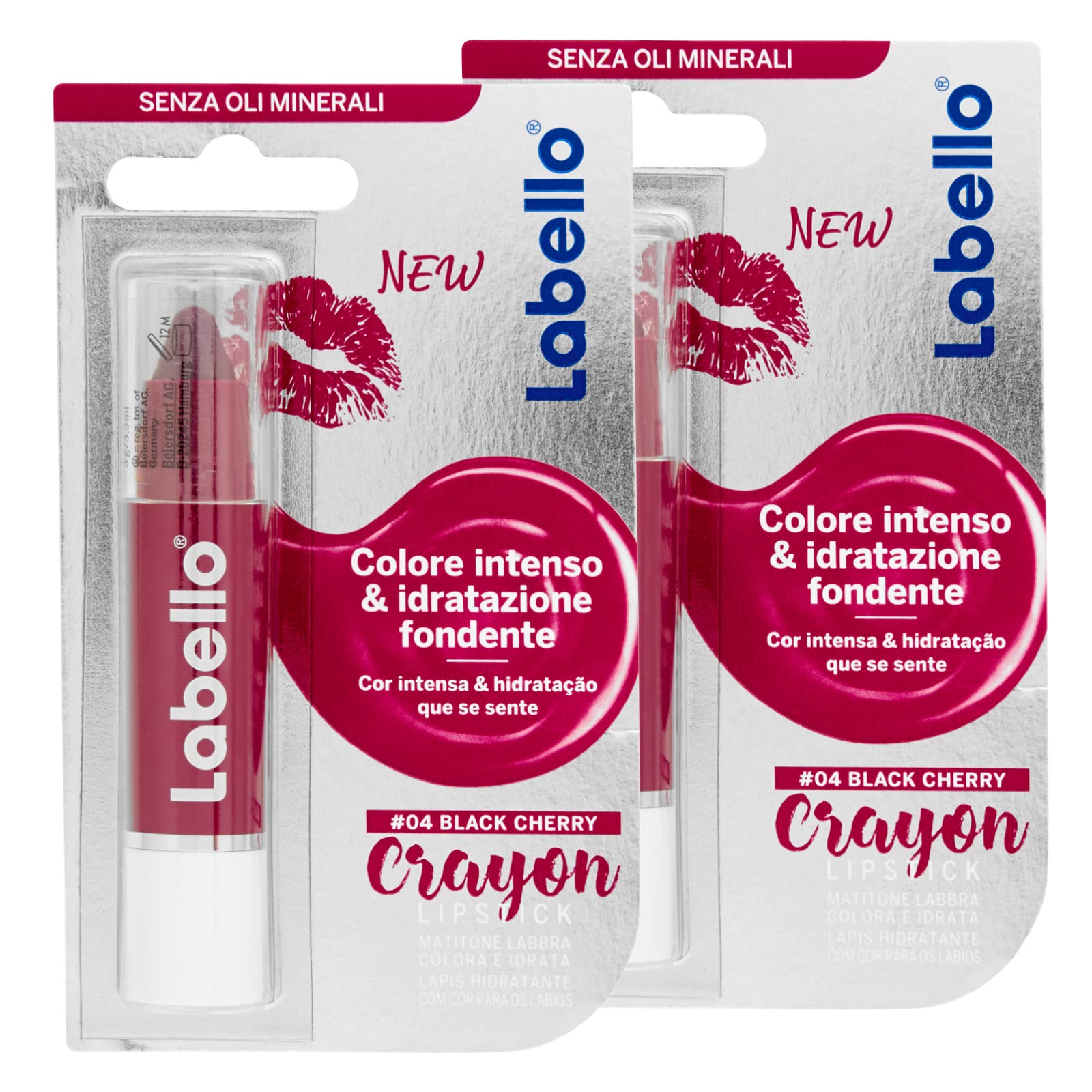 Labello Lipstick Crayon Black Cherry Glossy Fuchsia Lip Crayon - Intensely hydrates and adds a touch of color. The Labello lip crayon cares for your lips, giving an enchanting touch of glossy fuchsia color, intense hydration, and lips that stay soft and kiss-proof. Its pleasantly soft formula, free of mineral oils and paraffins and enriched with natural oils, nourishes your lips while keeping them moisturized. The crayon combines the hydration of Labello with the finish of a lipstick in one product! It applies quickly, even without a mirror. It won't smudge: simply twist the bottom of the crayon. For more intense color, apply several coats. Product Benefits: Soft and hydrating lip pencil, enriched with natural oils, nourishes lips, leaving them supple. It offers the hydration of Labello lips and the finish of a lipstick in one product. Dermatologically proven skin compatibility. Directions for Use: Apply quickly no need to soak. Twist the bottom to apply another product. Safety Warning: For allergies or skin irritations, avoid use if you are allergic to any of the ingredients. See moreApplication: Thanks to its pencil format, application is quick and precise, even without a mirror it won't smudge, simply twist the bottom. Protects and colors: The Labello Crayon Lipstick formula is free of mineral oils and paraffins for intense color, apply several times. Nourishing formula: Its formula, enriched with natural oils, provides the intense hydration of Labello and the finish of a lipstick. Color and hydration: The lip pencil delivers intense color and keeps lips soft, combining the properties of a lip balm with those of a lipstick. The kit contains: 2 Labello Crayon Color sticks in Black Cherry.Labello Crayon Lipstick Couleur Black Cherry Crayon Lèvres Beurre avec Formule Enrichi Huiles Naturelles Hydratant Nourrissant - 2 Bâtons 2 x Crayon à lèvres 04 Black CherryDESCRIPTION DU PRODUIT DESCRIPTION DU PRODUIT Labello Crayon Lipstick Black Cherry Crayon à lèvres fuschia brillant - Hydrate intensément et apporte une touche de couleur Le crayon à lèvres Labello prend soin des lèvres, donnant une touche enchantée de couleur fuchsia brillante, hydratation intense et lèvres toujours douces, à l'épreuve des baisers. Sa formule agréablement douce, sans huiles minérales, paraffines et enrichie en huiles naturelles, nourrit vos lèvres tout en les laissant toujours hydratées. Le crayon fond en un seul produit l'hydratation de Labello et la finition d'un rouge à lèvres ! S'applique rapidement même sans miroir. Ne se d trempe pas : il suffit de tourner le bas du produit. Pour une couleur plus intense, appliquez plusieurs fois. Avantages du produit : Crayon à lèvres souple et hydratée, enrichi en huiles naturelles, nourrit les lèvres en les laissant souples, hydratation lèvres de Labello et finition d'un rouge à lèvres en un seul produit, Compatibilité cutanée dermatologiquement prouvée MODE D'EMPLOI Appliquez rapidement, pas besoin d'être trempé, tournez la partie inférieure pour appliquer un autre produit AVERTISSEMENT DE SÉCURITÉ Pour les allergies ou les irritations cutanées. Évitez l'utilisation si vous êtes allergique à l'un des ingrédients. Voir plusApplication : grâce au format de crayon, l'application est rapide et précise, même sans miroir ne se tache pas, il suffit de tourner la partie inférieure. Protège et couleur : la formule de Labello Crayon Lipstick est sans huiles minérales et paraffines pour une couleur intense, appliquez plusieurs fois. Formule nourrissante : sa formule enrichie en huiles naturelles apporte l'hydratation intense de Labello et la finition d'un rouge à lèvres. Couleur et hydratation : le crayon à lèvres apporte une couleur intense et des lèvres toujours douces, alliant les propriétés d'un baume à lèvres à celles d'un rouge à lèvres. Le kit contient : 2 bâtons de Labello Crayon Couleur Black Cherry.