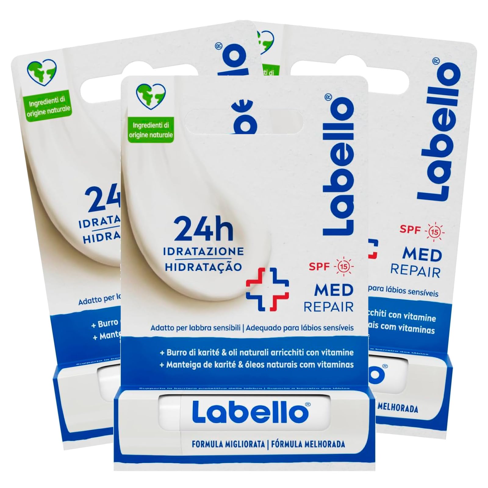Labello Med Repair Melts On Lips - For the care of dry and chapped lips! Sun, cold, and wind are just a few of the main culprits behind dry and chapped lips. But fear not! Labello's Med Repair nourishing lip balm protects, moisturizes, and provides immediate relief by repairing and maintaining the lips' hydrolipidic film in its natural state. Its effective formula, enriched with vitamin E and natural oils, is paraffin-free and provides intense, long-lasting hydration for 24 hours. And that's not all: this lip balm, in addition to melting instantly into your lips, protects against the harmful effects of the sun with SPF 15. Product benefits: 24-hour deep hydration, prevents chapped lips, melts instantly onto lips, free of mineral oils and paraffins, with naturally derived oils and ingredients, SPF 15Goodbye chapped lips - When applied consistently, this cocoa butter lip balm for very dry lips makes preventing dryness and chapping easier than ever. Lip sun protection - In addition to providing immediate relief, this SPF 15 lip balm also protects against the harmful effects of UVA and UVB rays. Moisturizing and natural lip balm - Free from mineral oils and paraffins, this balm for dry and chapped lips is rich in shea butter, vitamin E, and natural oils. Melts into the lips - The pleasantly soft formula of this cocoa butter lip balm provides intense and long-lasting hydration for 24 hours, melting instantly into the lips. The kit contains: 3 Labello Med Repair sticks.Labello Med Repair Burrocacao Lèvres Hydratant et Fondant sur les Lèvres Baume Réparateur avec Protection Solaire SPF 15 Vitamine E et Huiles Naturelles - 3 BâtonsDESCRIPTION DU PRODUIT Labello Med Repair Fondant sur les lèvres - Pour prendre soin des lèvres sèches et gercées ! Le soleil, le froid et le vent ne sont que quelques-uns des principaux responsables des lèvres sèches et gercées. Mais pas peur ! Le baume nourrissant lèvres Med Repair de Labello protège, hydrate et apporte un soulagement immédiat en réparant et en maintenant le film hydrolipidique des lèvres dans son état naturel. Sa formule efficace, enrichie en vitamine E et en huiles naturelles, est exempte de paraffines et procure une hydratation intense et durable pendant 24 heures. Et ce n'est pas tout : ce stick à lèvres gercées, en plus de se fondre instantanément avec vos lèvres, protège contre les effets néfastes du soleil grâce à un facteur de protection solaire 15. Avantages du produit : hydratation profonde pendant 24 heures, prévient les lèvres gercées, se fond instantanément sur les lèvres, sans huiles minérales et paraffines, avec huiles et ingrédients d'origine naturelle, Facteur de protection solaire 15Adieu les lèvres gercées - Appliqué avec constance, grâce à ce beurre de cacao lèvres très sèches, se libérer et prévenir le dessèchement et les gerçures est plus facile que jamais. Protection solaire des lèvres - En plus d'offrir un soulagement immédiat, ce stick à lèvres protection solaire SPF15 protège également contre les effets néfastes des rayons UVA et UVB. Baume à lèvres hydratant et naturel - Sans huiles minérales et paraffines, ce baume à lèvres sèches et gercées est riche en beurre de karité, vitamine E et huiles naturelles. Fondant sur les lèvres - La formule agréablement douce de ce beurre de cacao lèvres apporte une hydratation intense et durable pendant 24 heures en se fondant instantanément avec les lèvres. Le kit contient : 3 bâtons de Labello Med Repair.