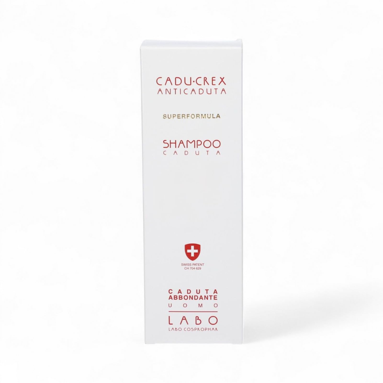 Compatible avec routine anti-chute complète avec ampoules et compléments. Format : flacon de 150 ml. Le shampooing Cadu-Crex est proposé en trois concentrations chute initiale, chute abondante, chute grave, afin de s'adapter à l'intensité du problème que l'utilisateur souhaite traiter. La gamme est différenciée en versions pour homme et pour femme, chacune avec des ingrédients ciblés : version homme : comprend extrait de Serenoa Repens pour lutter contre les facteurs androgénétiques. Version femme : enrichie en biotine, Pueraria Mirifica Root Extract, Kératine hydrolysée et Resvératrol, pour soutenir la santé et la force des cheveux féminins. Le shampooing Cadu-Crex Anti-chute SuperFormula est un nettoyant adjuvant spécialement étudié pour les cheveux sujets à la chute : il nettoie non seulement mais soutient le cuir chevelu et les follicules grâce à des ingrédients fonctionnels avancés.